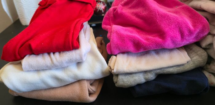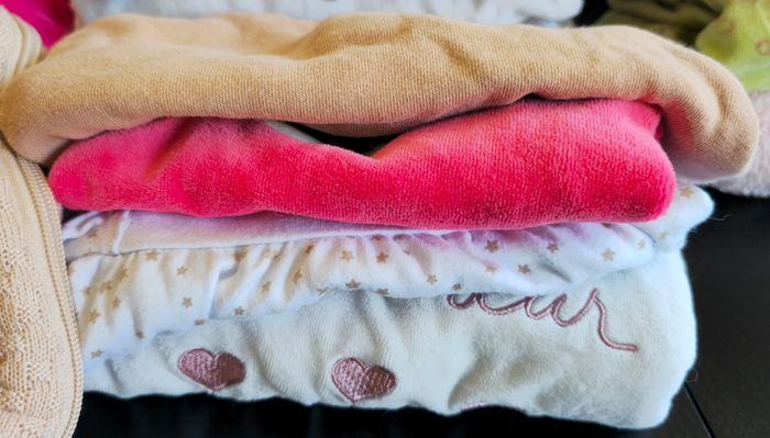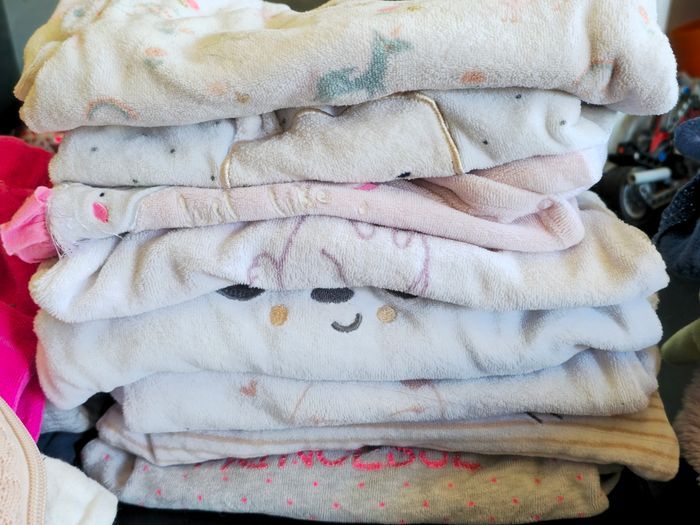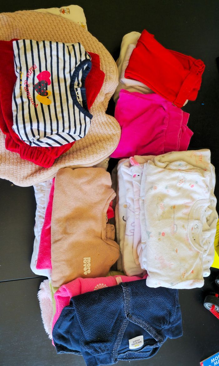 11 bodys, 4 vestes, 4 hauts, 9 pyjamas, 8 pantalons, un ensemble et 2 turbulettes. Au final tout n’a pas été très souvent porter