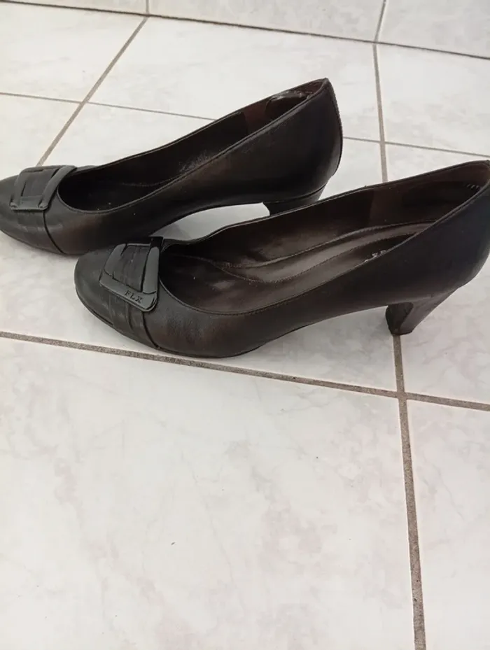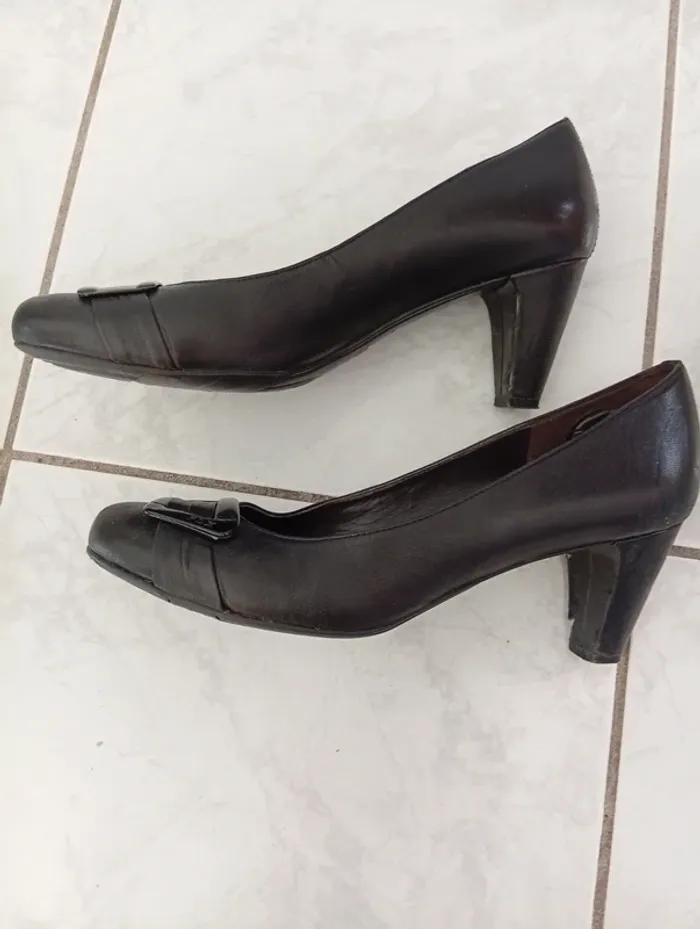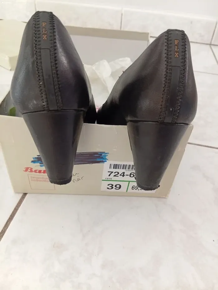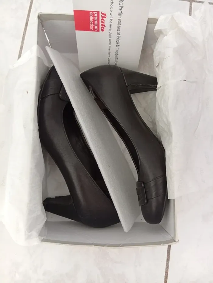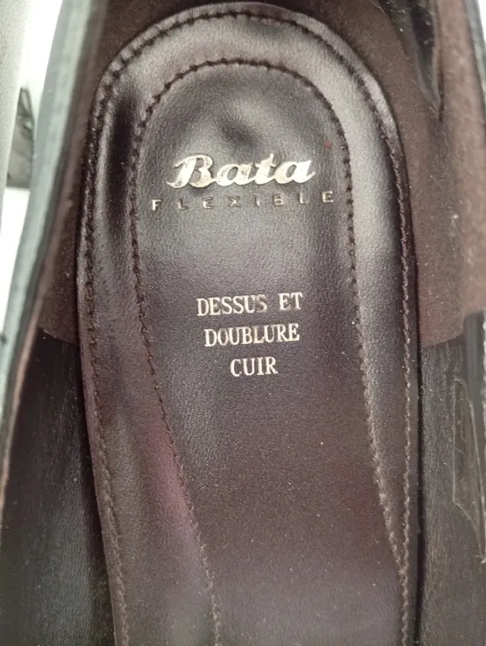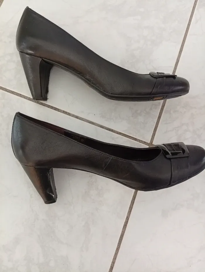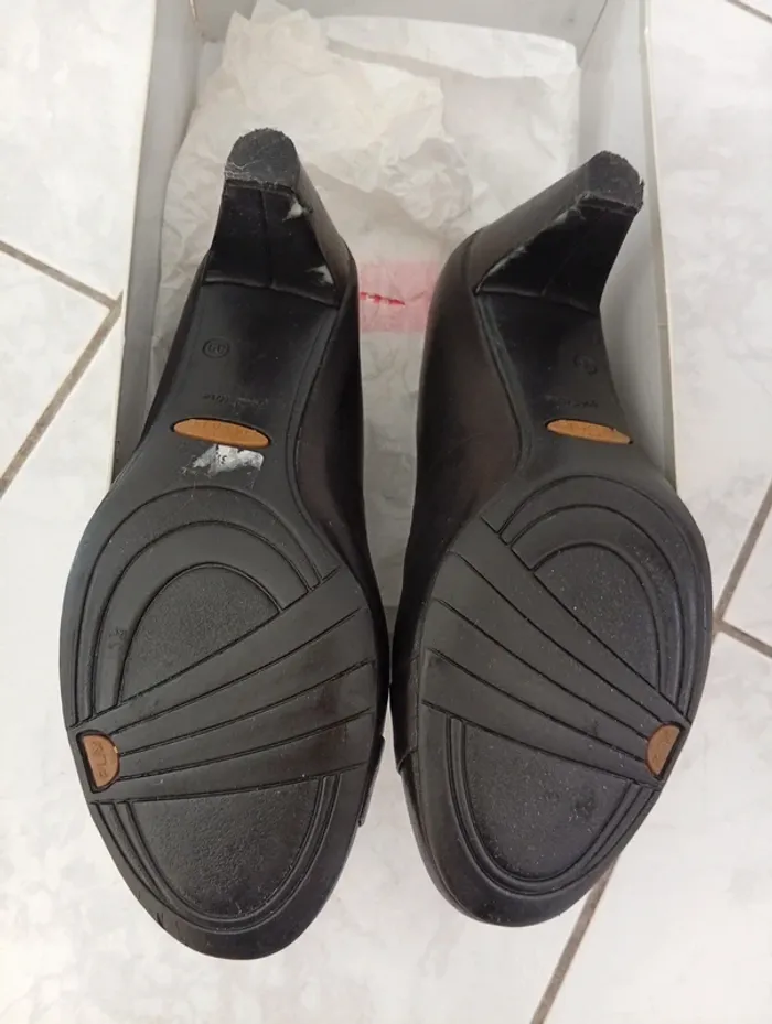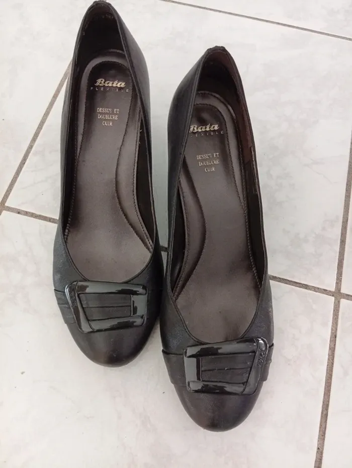 Escarpin taille 39 de chez Bata en cuir noir. Accros au niveau des talons voir photos,reste en bon état .