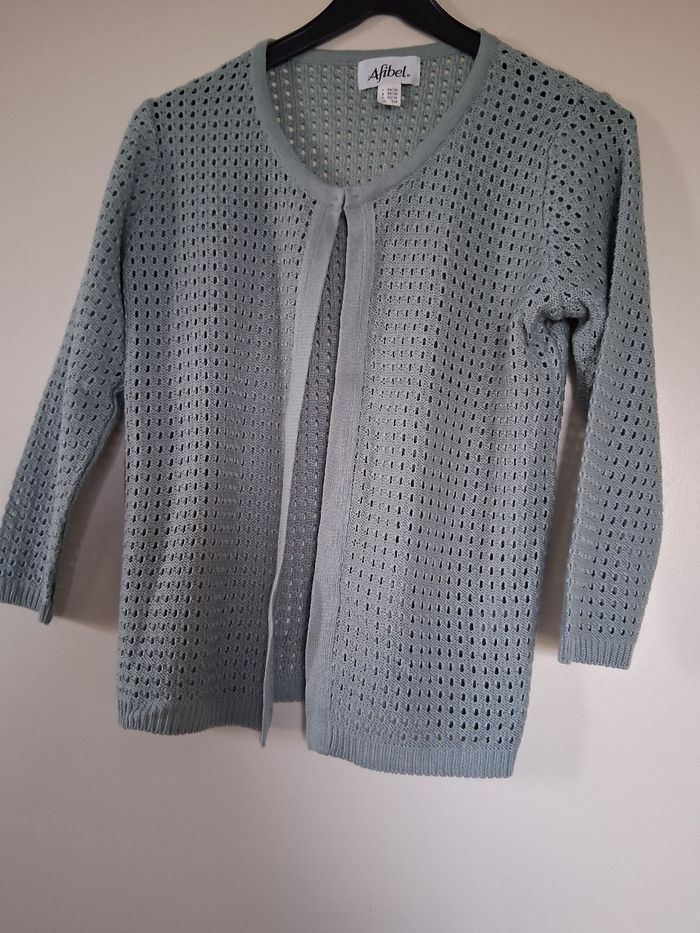 Gilet " afibel " manche longue. Attache crochet en haut. Ajouré de trou. En 100 acrylique Vert T- 34-36 sur étiquette Excellent état comme neuf
