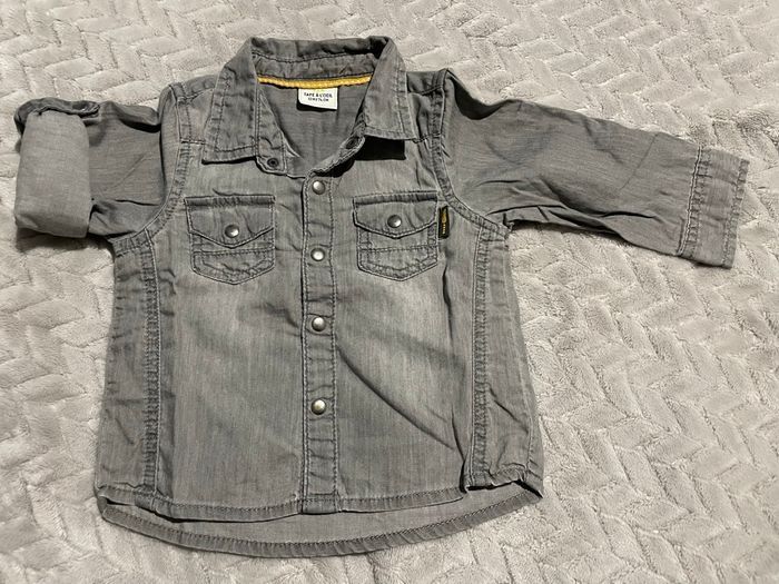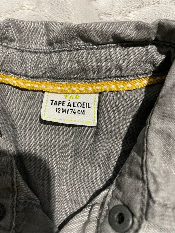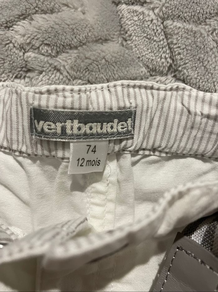 Ensemble garçon comprenant : - 1 pantalon blanc avec ceinture (Vertbaudet) - 1 chemise grise pressionnées avec manches retroussables (Tape à l’œil) - 1 chapeau Taille 12 mois