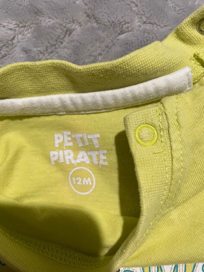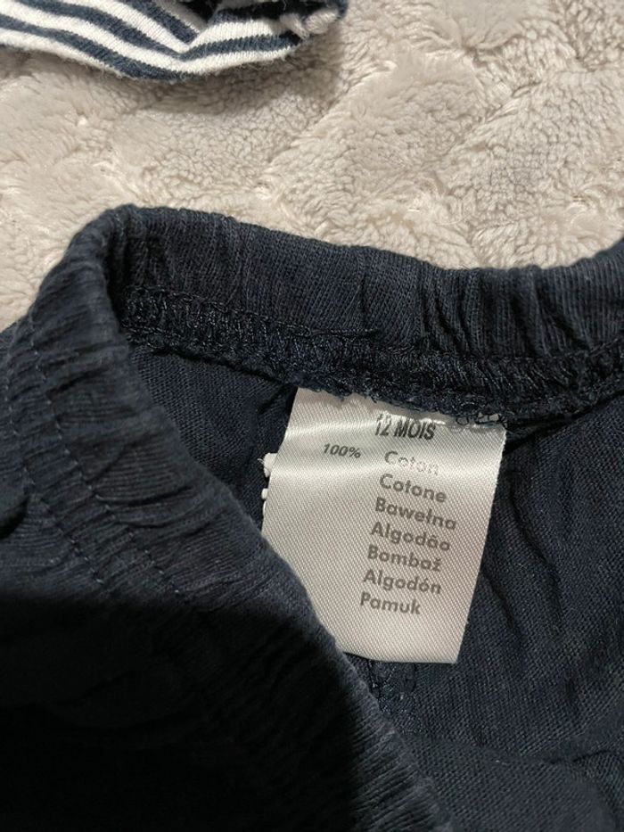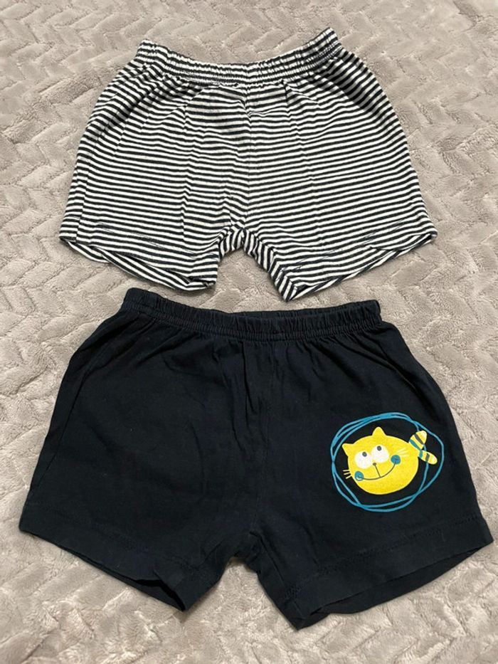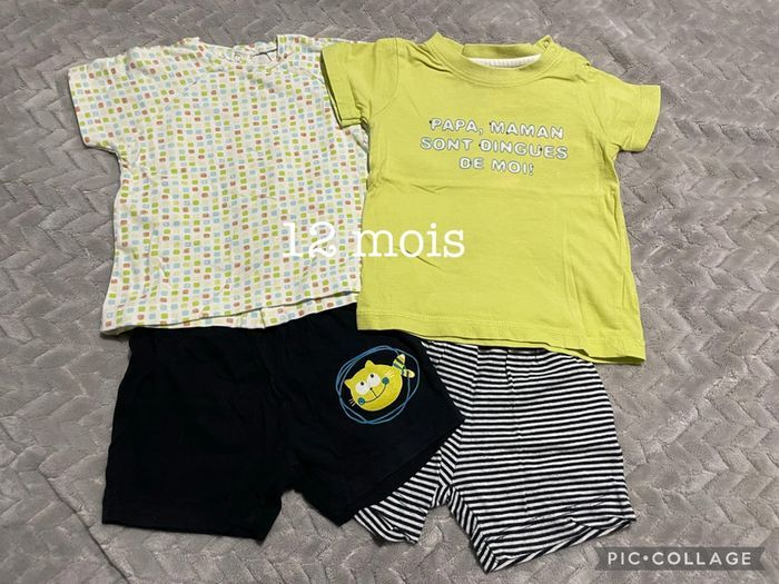 Ensemble garçon comprenant : - 2 shorts coton - 2 tshirts manches courtes Le t-shirt vert à une tâche de décoloration sur le devant (voir photo) Taille 12 mois