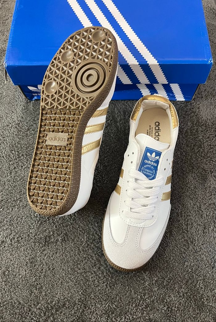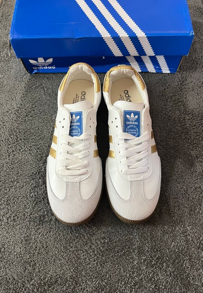 Basket Adidas samba blanche et doré ⚠️ petite pliure au niveau du talon , signe samba un peu effacé, ( voir sur 2 dernières photos ) ⚠️ Taille 40 Neuves jamais portée Envoie 24h maximum Prix : 30€