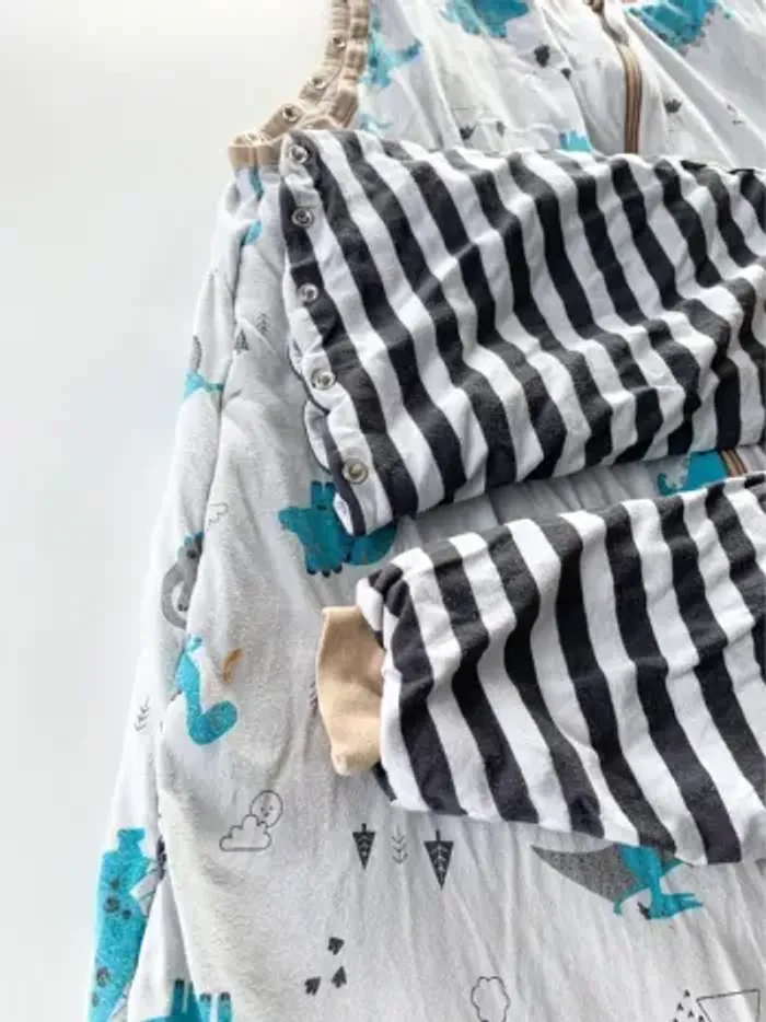 schlummersack Slumbersac CHAUDE SANS SURCHAUFFE : La gigoteuse avec pieds est bien rembourrée et permet également une bonne circulation de l´air. Parfaite pour les températures ambiantes de 15 à 21 degrés - idéale pour toute l'année, surtout au printemps, en automne et en hiver. ANTIDÉRAPANTE POUR UNE SÉCURITÉ OPTIMALE : Les couvre-pieds protègent les pieds des enfants du froid et le système antidérapant les empêche de glisser sur les revêtements de sol lisses. ASSEZ D'ESPACE POUR BOUGER : Cette turbulette avec jambes offre aux enfants une liberté de mouvement maximale tout en restant bien chaude. Une fermeture éclair conçues pour une protection optimale du menton à l´habillage et au déshabillage. UTILISATION POLYVALENTE DES MANCHES : La gigoteuse avec pieds a des manches légèrement rembourrées qui sont pratiques et faciles à retirer grâce aux boutons-poussoir ! FABRIQUATION DE HAUTE QUALITÉ CERTIFIÉE Oeko-Tex : Les gigoteuses en tissu Modal sont particulièrement respirants grâce aux propriétés uniques de ce matériau. De plus, le tissu Modal est robuste et durable malgré sa structure délicate, en faisant le choix parfait pour les vêtements résistants comme les gigoteuses pour bébés. 2 taches visibles sur les deux dernières photos Nos vêtements sont toujours lavés et garantis sans trou 👌🏻 Maison non fumeur, sans poils d’animaux