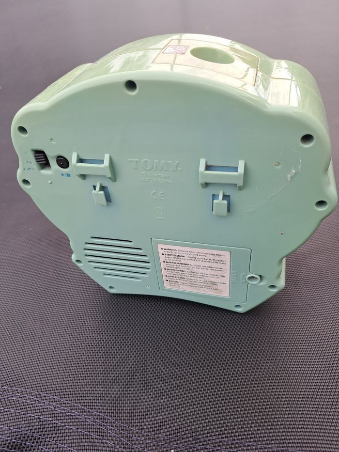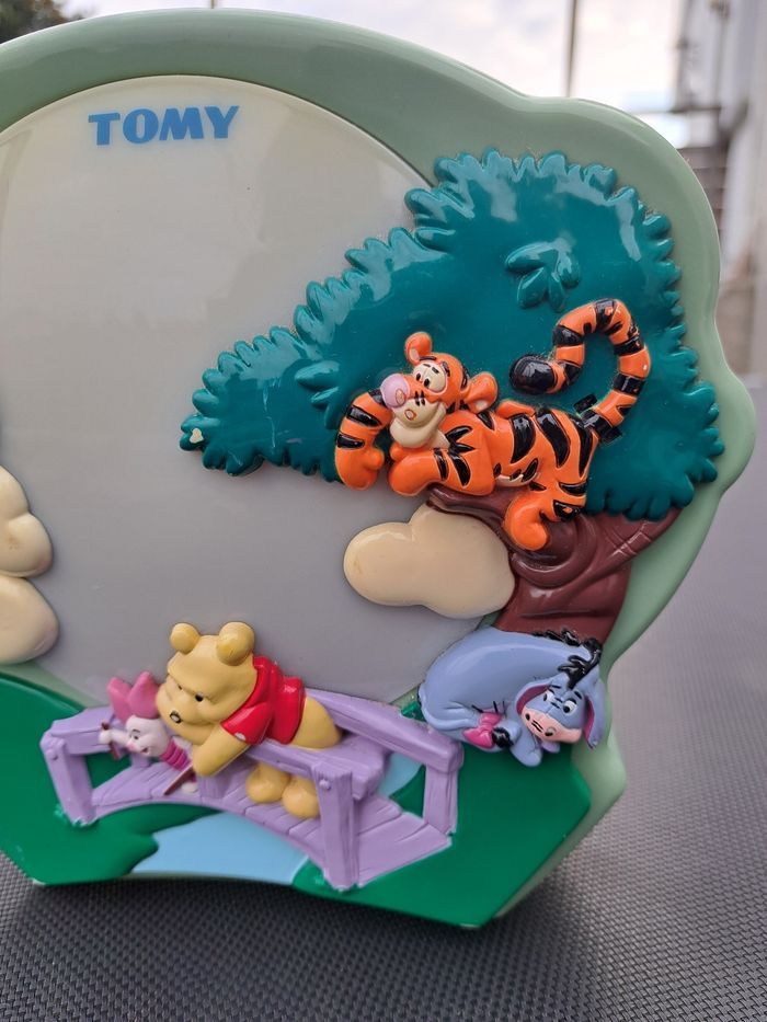 Veilleuse à piles (non fournies) avec Winnie l'ourson, tigrou et tous les copains Fait de la musique Fonctionne très bien. Couleurs un peu passée