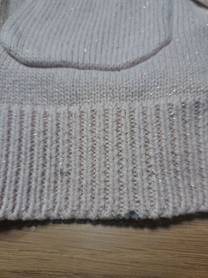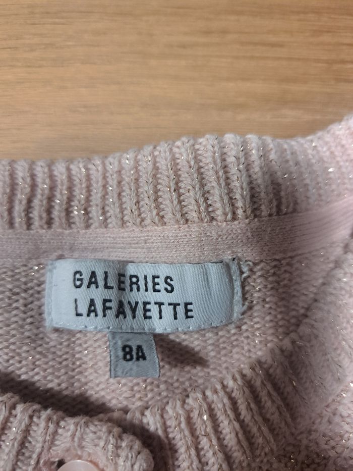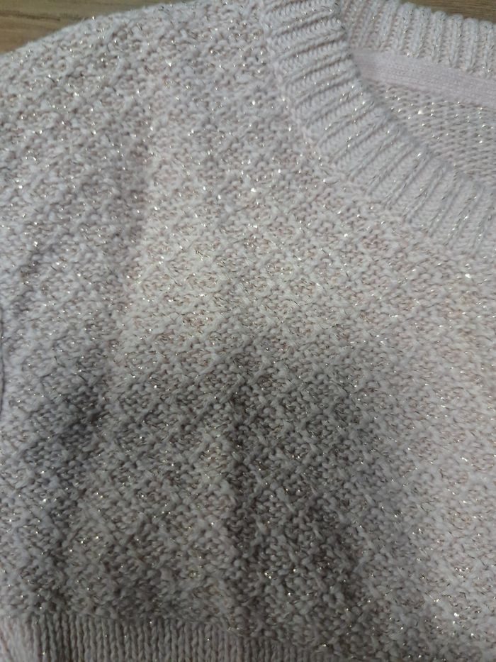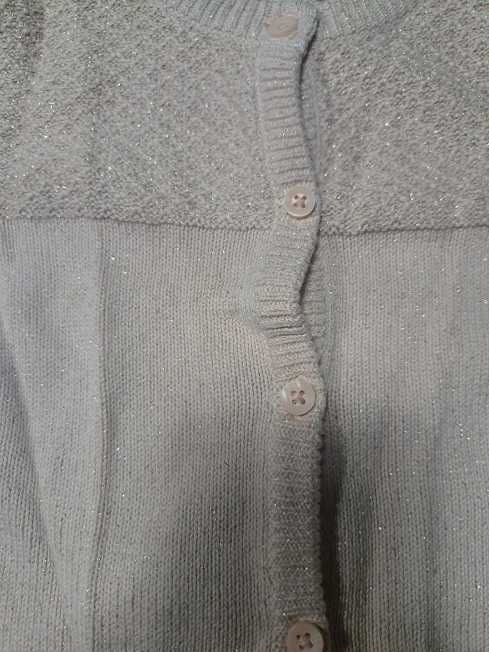 Couleur rose pâle pailleté doré Juste une toute petite tâche dans le bas du gilet mais se voit peu une fois porté (cf dernière photo) #silak98ans #giletfille8ans #giletgalerieslafayette #giletgalerielafayette8ans
