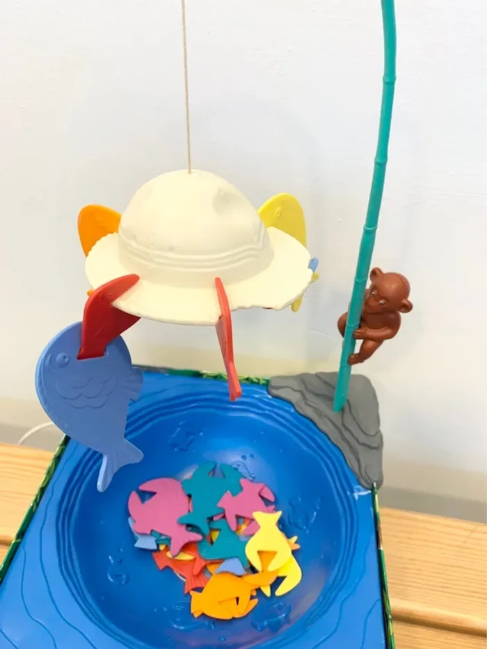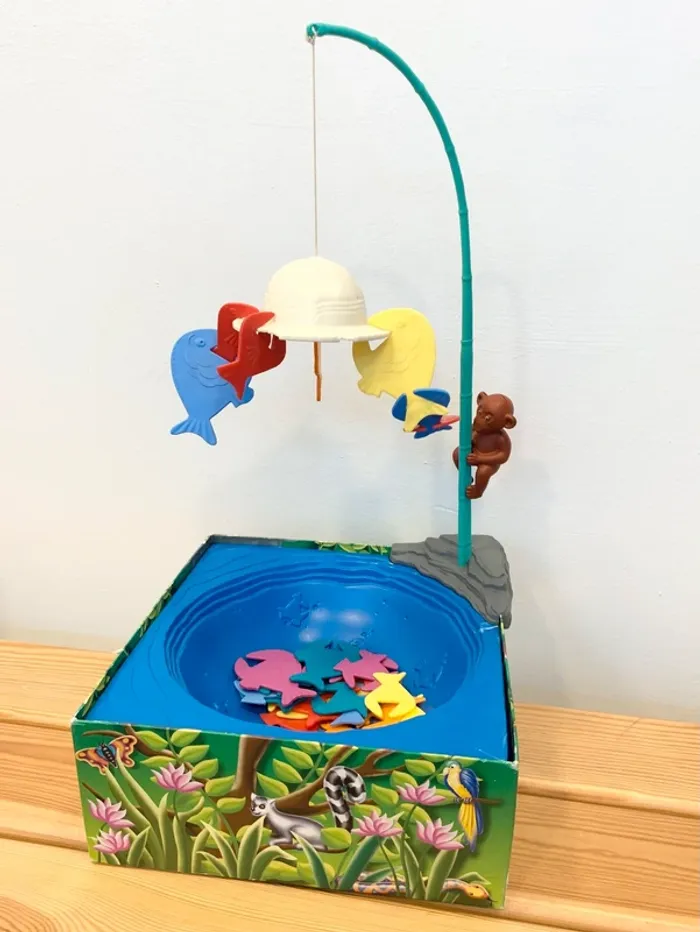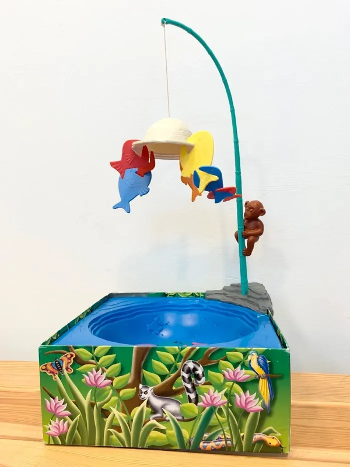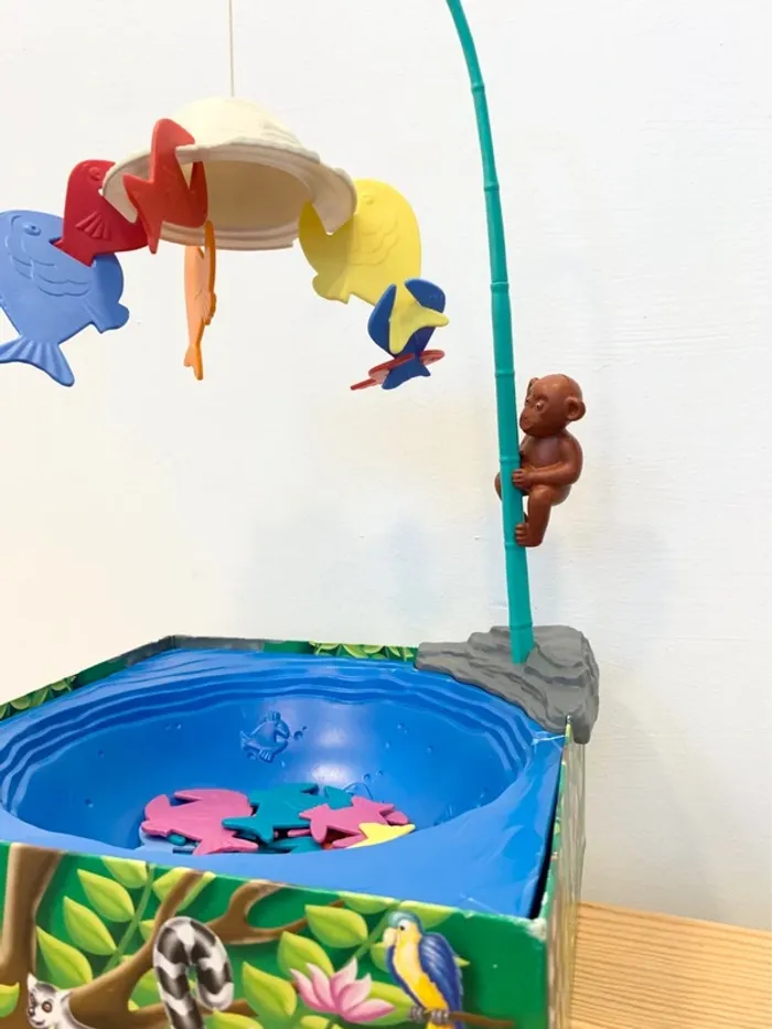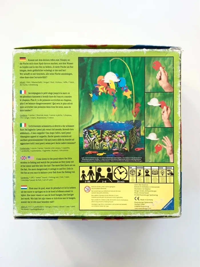 Les piranhas s'acrochent au chapeau de l'explorateur.Un jeu d'habileté. L'équilibre ne tient qu'à un fil ! A la tête d'une équipe de piranha à votre couleur vous allez devoir accrocher ceux-ci au chapeau de l'explorateur puis aux autres piranhas. On peut s'acrocher à tout ce qui dépasse pourvu que cela tienne et qu'aucun priranha de même couleur ne s'acroche entre eux. Le premier qui réussit à faire tenir en l'air toute son équipe remporte la partie. Contient : 1 rocher, 32 poissons sur 36, 1 canne, 1 chapeau, 1 fil, 1 singe, 1 marre. Jeu d'adresse amusant pour petits et grands.