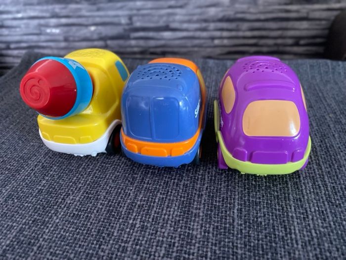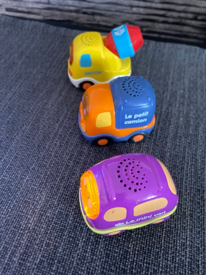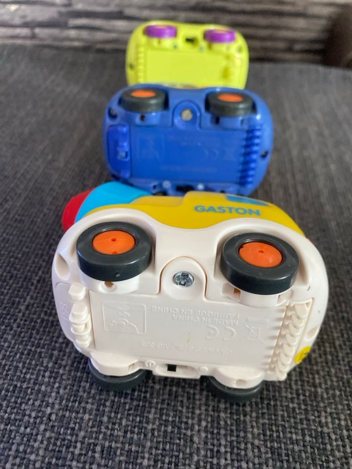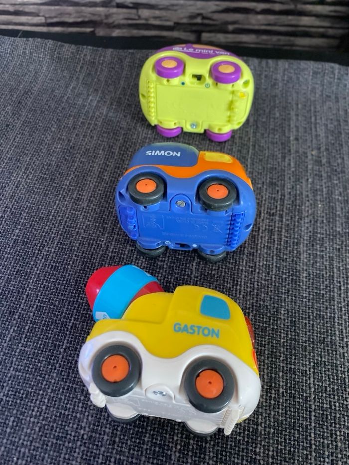 Lot 3 voitures tut tut bolides Vtech Erwan pour le mini van Simon pour le petit camion Gaston pour le camion toupie béton Piles fournies Vtech Si besoin J'ai d'autres choses en tut tut bolides, plusieurs circuits et aussi d'autres véhicules, voir en descendant sous cette annonce