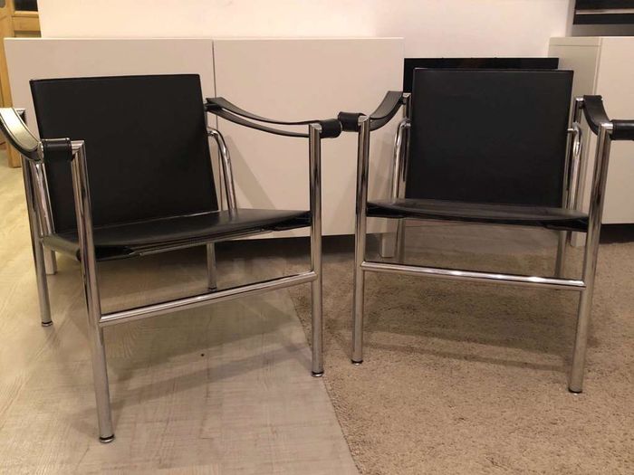 Paire de fauteuils LC1. Cadre tubulaire chromé et cuir noir d’origine. - photo numéro 1