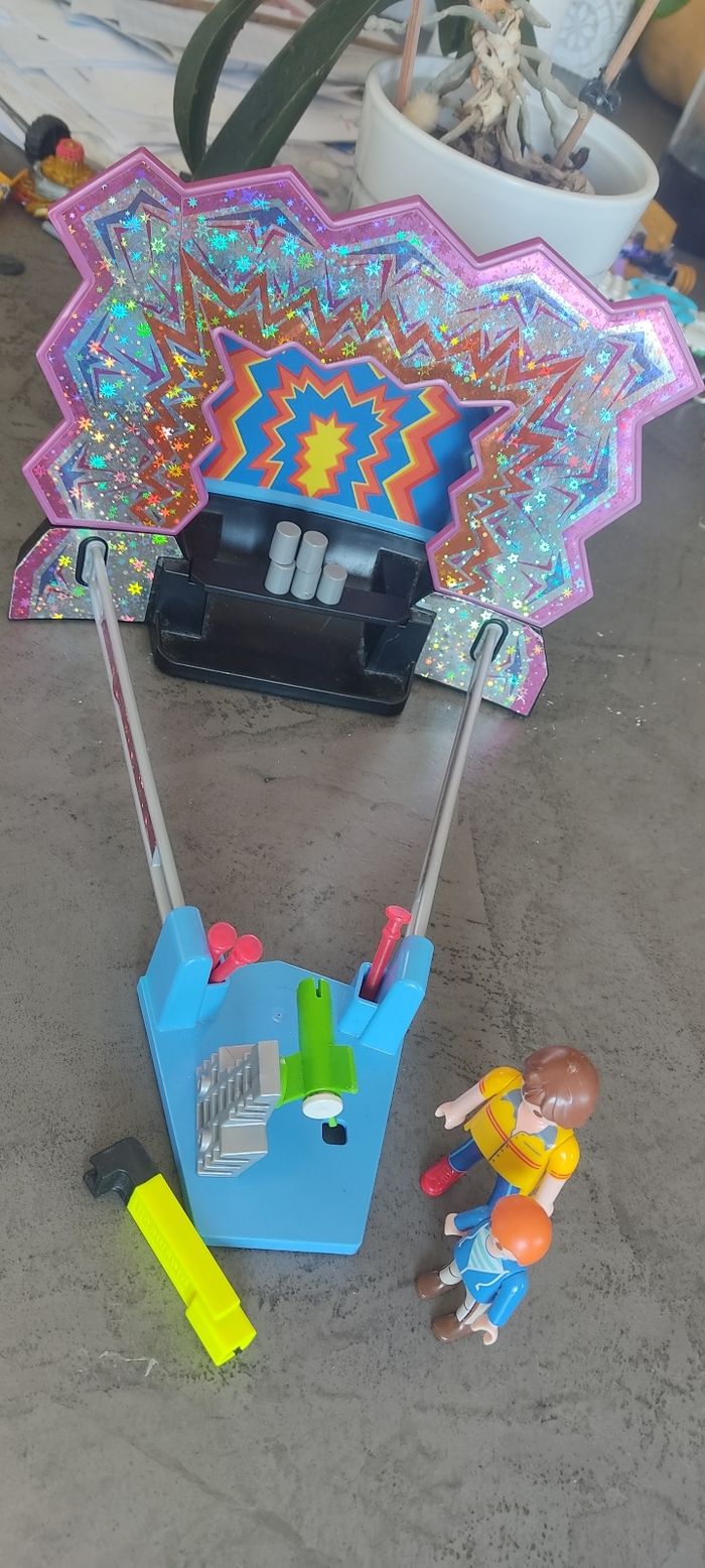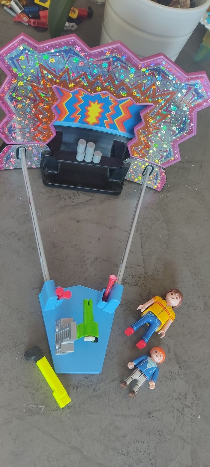 Playmobil fête foraine stand chamboule tout contient 1 playmobil adulte, 1 enfant,3 fleches et des boîtes. Bon état