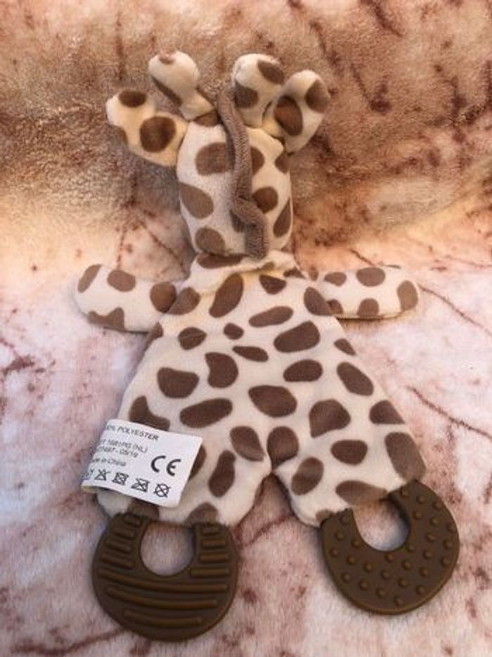 Doudou plat girafe en velours blanc marron Anneaux de dentition et bruit de papier froissé Action Occasion en très bon état Vous achetez le doudou que vous voyez sur la photo