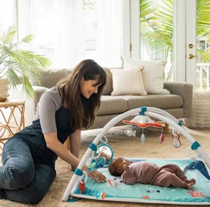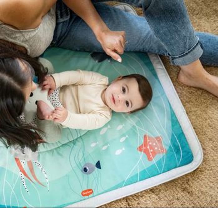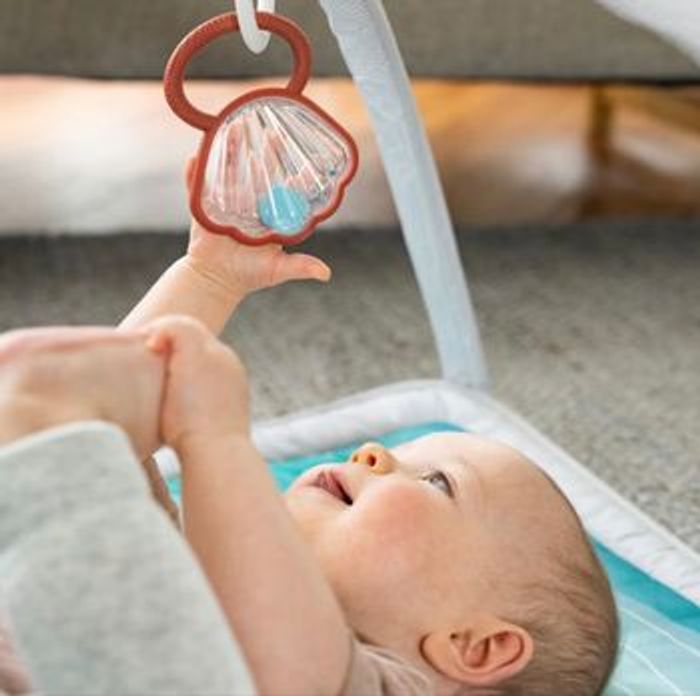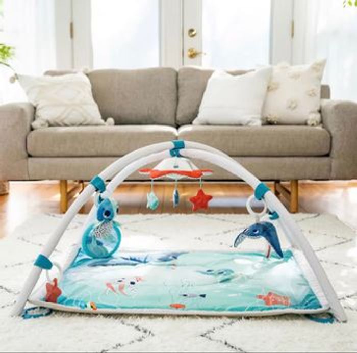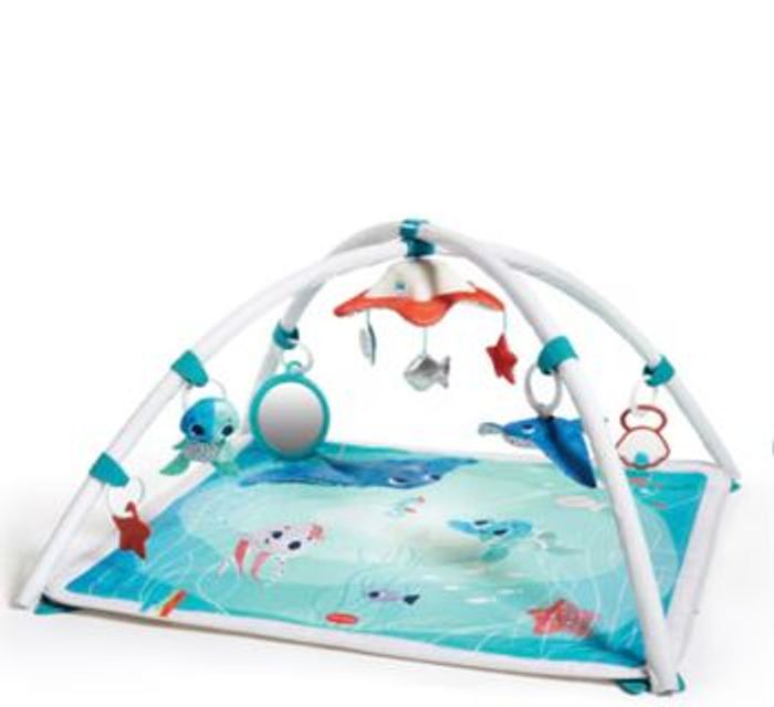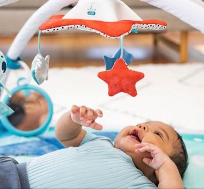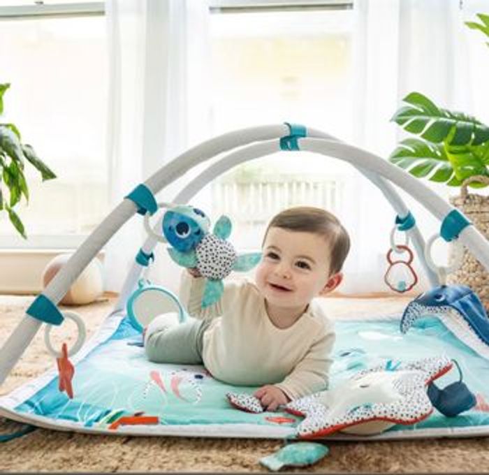 2-1 Mobile Musical Gymini® Treasure the Ocean Développe pas moins de 6 capacités d'éveil, proposant un équilibre idéal entre l'amusement et le développement. Avec son jouet étoile de mer musicale interactive, ses adorables personnages sous-marins et ses 18 activités attrayantes, le tapis d'éveil crée un monde enchanteur de jeu océanique pour votre bébé. Le tapis d'éveil mobile musical 2 en 1 Trésor de l'océan de Tiny Love est un tapis d'éveil à la conception unique doté d'un magnifique mobile musical étoile de mer. La décoration magique sur le thème de l'océan du tapis d'éveil musical, façonnée avec une technique d'aquarelle spéciale et une palette bleu turquoise enchanteresse, crée un superbe environnement permettant aux bébés de jouer et de grandir. Doté de l'étoile de mer mobile et jouet tactile pour la position sur le ventre, ce tapis d'éveil aquatique pour nouveau-né propose également un mobile musical ! En tant que mobile suspendu, le jouet étoile de mer émet de charmants sons de la mer et de l'océan, un superbe spectacle lumineux et une sélection de 6 mélodies, dont une spécialement composée par le propre musicothérapeute de Tiny Love. Avec ses nombreuses fonctionnalités avancées, telles que la minuterie d'arrêt automatique et 5 lumières LED avec effet de fondu, cet adorable mobile étoile de mer stimule les bébés tout en favorisant le développement. Utilisée en mode tactile, l'étoile de mer distrait les tout-petits pendant qu'ils font des efforts pour rester sur le ventre afin de favoriser leur motricité, en les aidant à avancer vers la prochaine étape. Le tapis d'éveil mobile musical 2 en 1 Tiny Love Trésor de l'océan contribue à l’éveil de votre bébé et favorise les apprentissages dans les domaines suivants : émotions, créativité, motricité, sens, cognition et communication. Le tapis d'éveil mobile musical 2 en 1 fait partie de la collection Trésor de l'océan, éduquant les tout-petits à aimer et à protéger l'océan Prix d’achat 80 euros Neuf dans son carton d’emballage