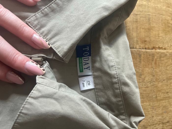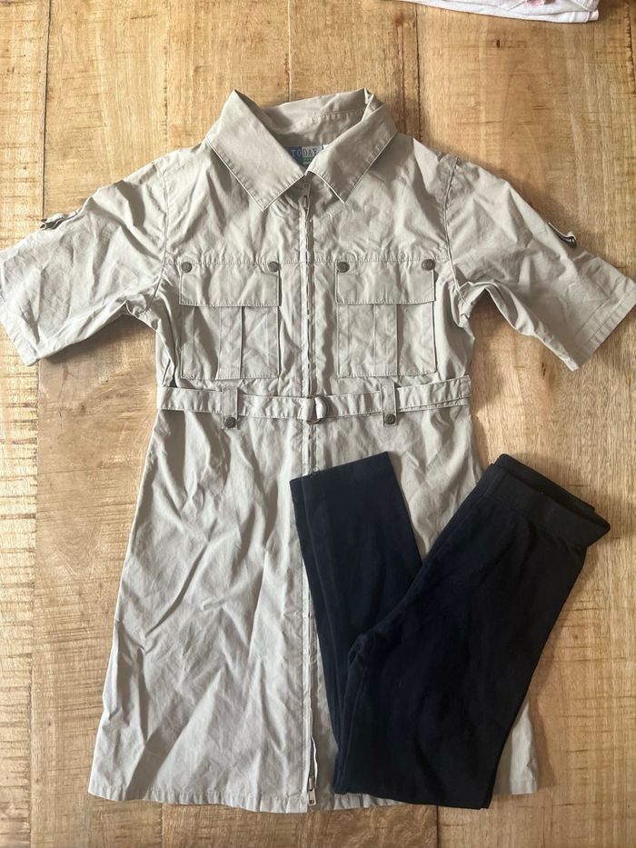 👗 1 tunique beige à manches courtes Vertbaudet, style saharienne avec ceinture et poches sur la poitrine.