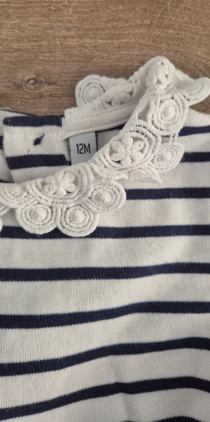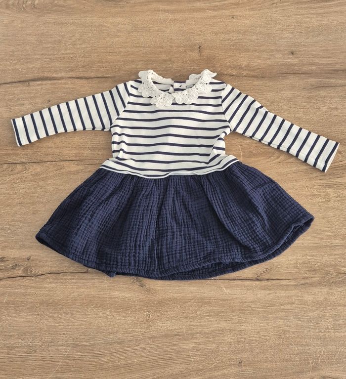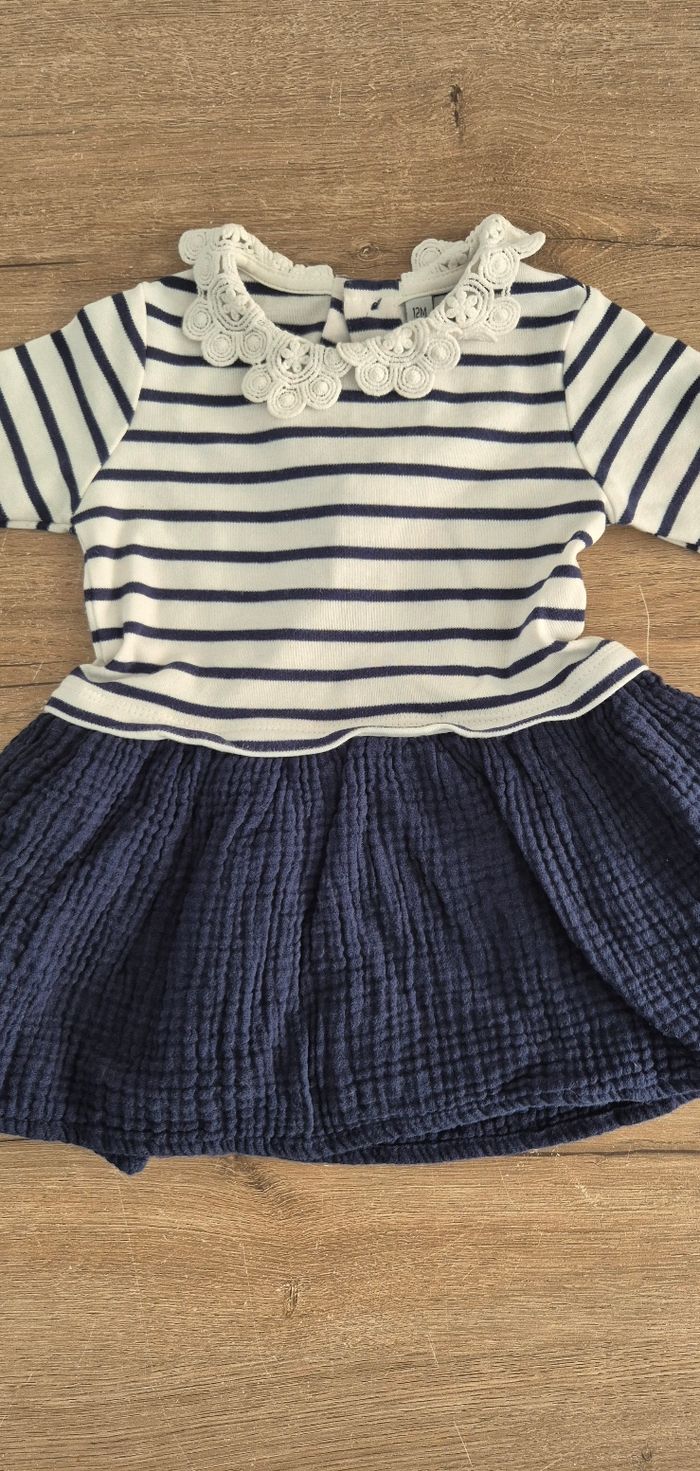 Robe à manches longues rayée type marinière avec jupe en gaz de coton, col dentelle Taille 12 mois Très bon état
