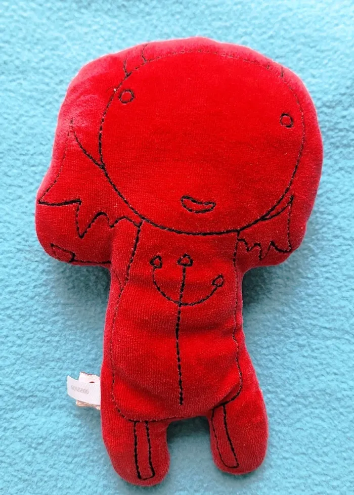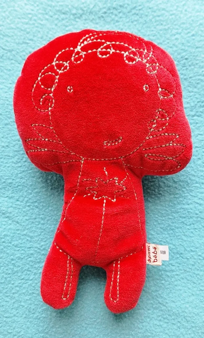 DOUDOU SEMI PLAT EN VELOURS DE COULEUR ROUGE BORDEAUX SUR UNE FACE EST BRODE UN ANGE EN BLANC ET SUR L'AUTRE FACE EST BRODE UN DIABLE EN NOIR GRELOT A L'INTERIEUR DOUDOU QUI MESURE 20CM ETAT NEUF !