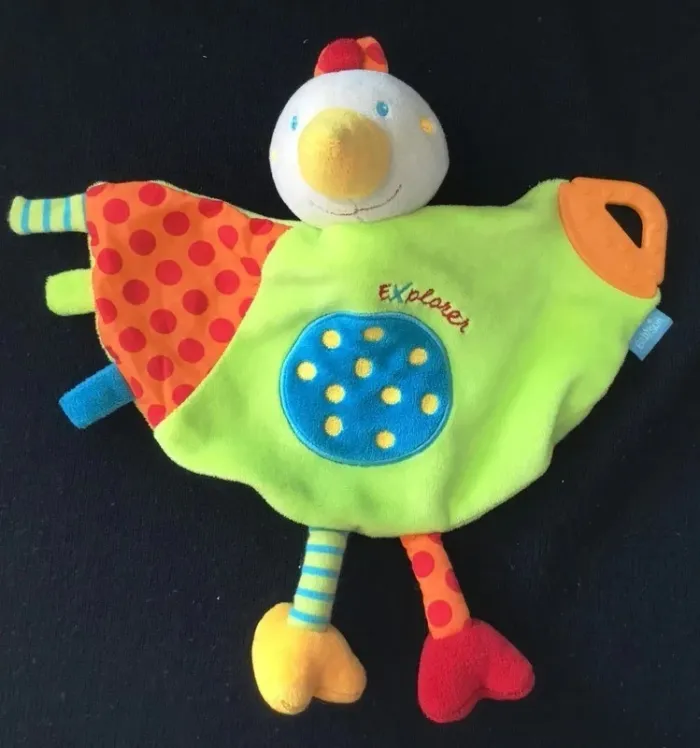 DOUDOU PLAT POULE EN VELOURS DE COULEURS VIVES SUR LE HAUT DU DOUDOU, TETE PELUCHE POULE ANNEAU DENTITION SUR UN COTE DIFFERENTES TEXTURES ET COULEURS POUR EVEILLER BEBE ETAT PARFAIT !