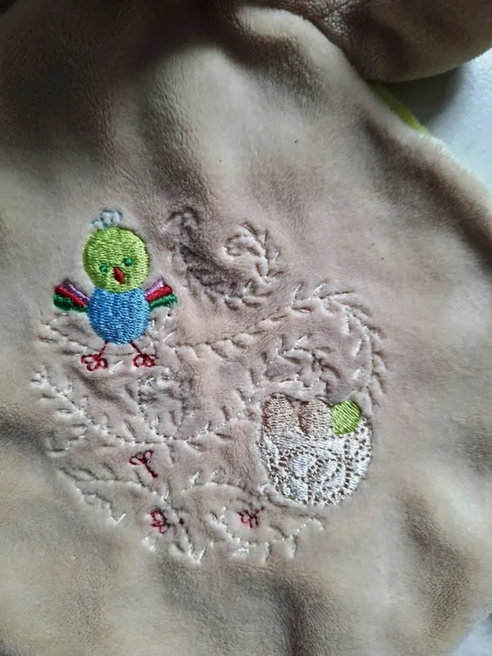 DOUDOU PLAT LOSANGE EN VELOURS DE COULEUR BEIGE SUR LE HAUT DU DOUDOU, TETE DE CHIEN AVEC FOULARD RAYE AUTOUR DU COU SUR LE DOUDOU SONT BRODES UN POUSSIN, UN PANIER AVEC DES OEUFS ET DES BRANCHES 3 NOEUDS RAYES ETAT NEUF !