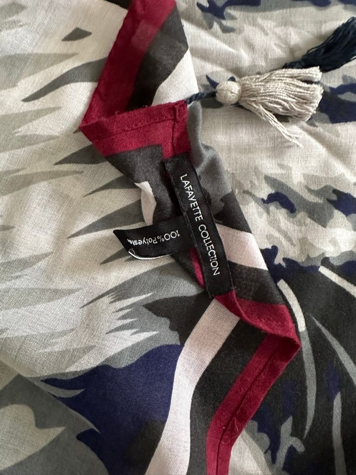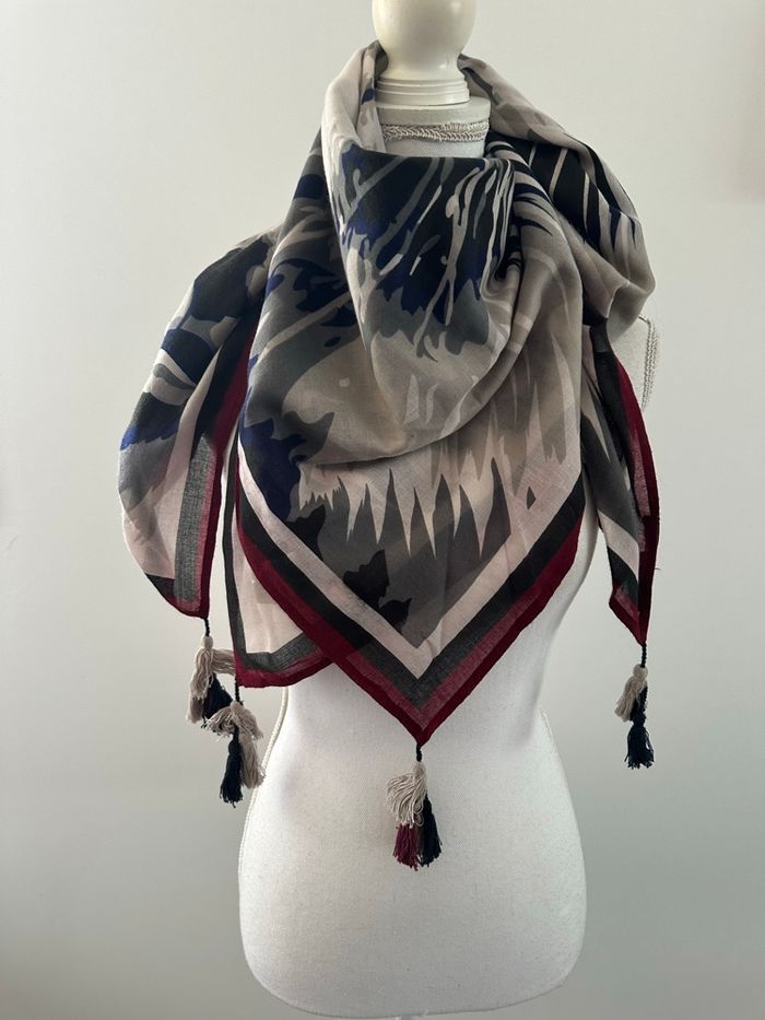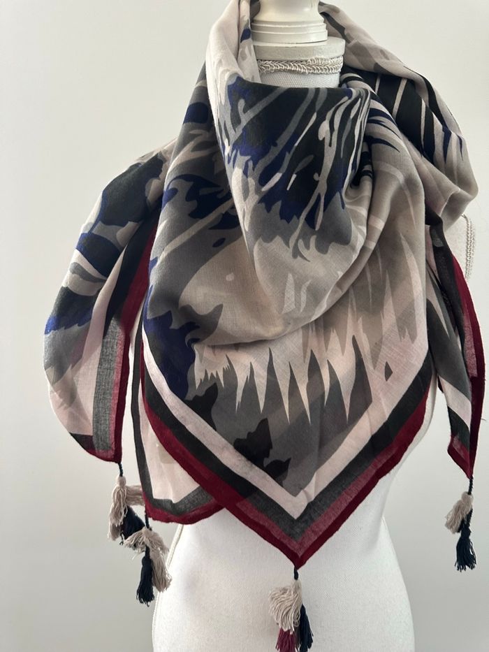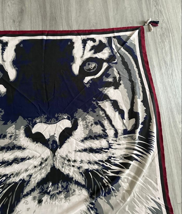 Foulard châle - Excellent état - Imprimé tigre - Galeries Lafayette, Lafayette collection - Bleu marine, blanc, gris, bordeaux - Pompons aux 4 extrémités - 100% polyester - Taille oversize XXL - 105x105cm