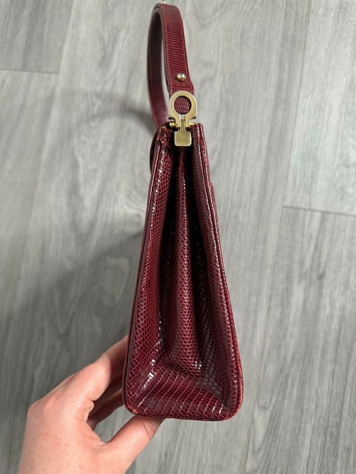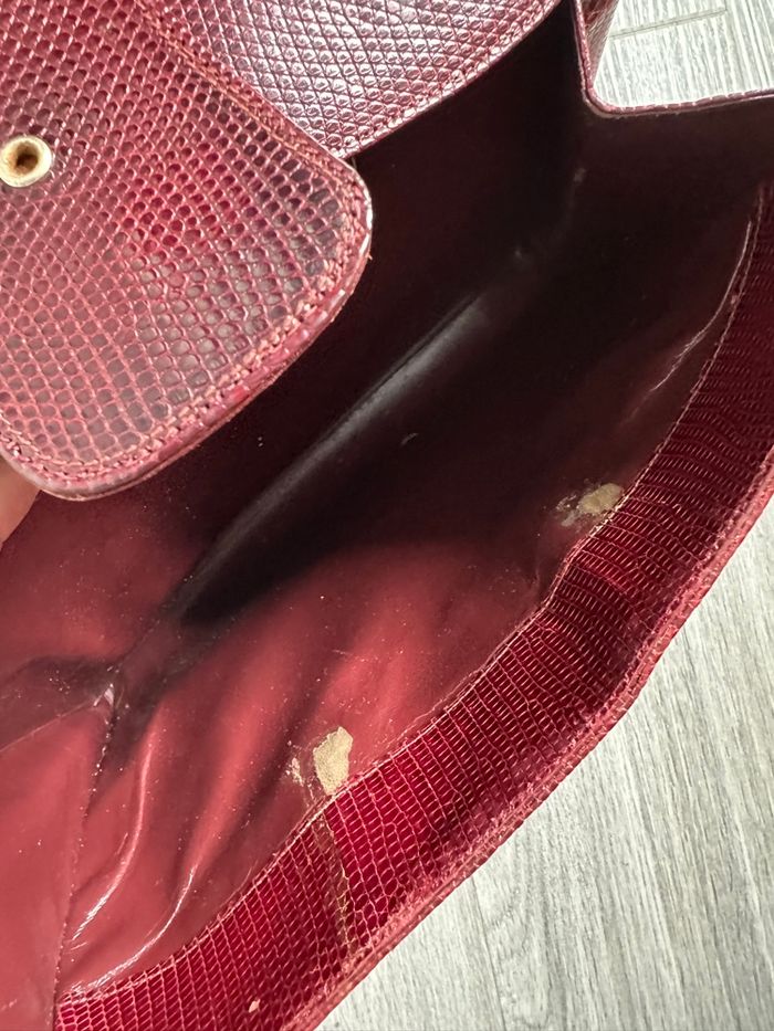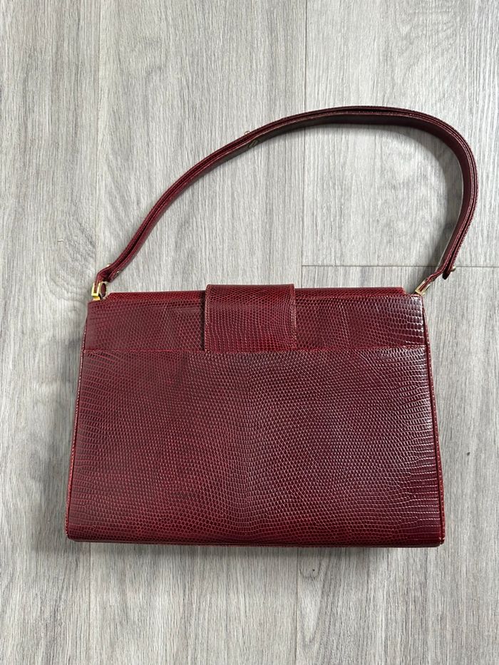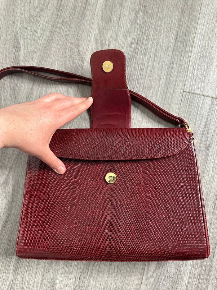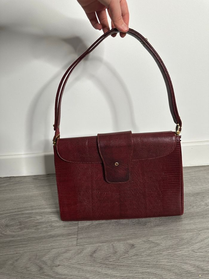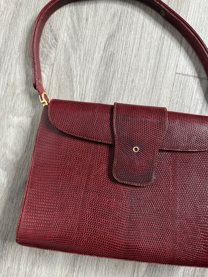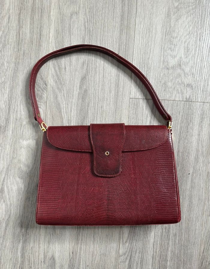 Sac à main - Excellent état - Couleur bordeaux - Marque Gsell - Vintage, années 60’ - Fabrication française 🇫🇷 - En cuir de vachette embossé style lezard, python, serpent - Se ferme avec une pression aimanté - Plusieurs compartiments intérieurs - Bijouteries métallique dorée - Anse réglable - Doublure intérieure légèrement frottée (voir photos) Dimensions: - 30cm de long - 7cm de profondeur - 20cm de haut sans la anse