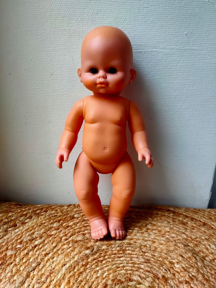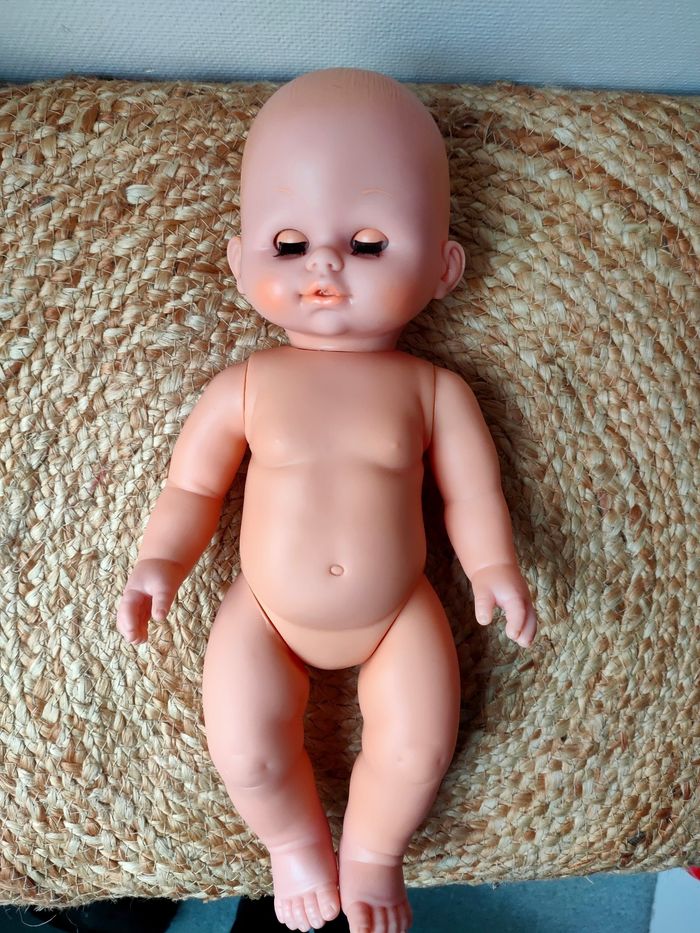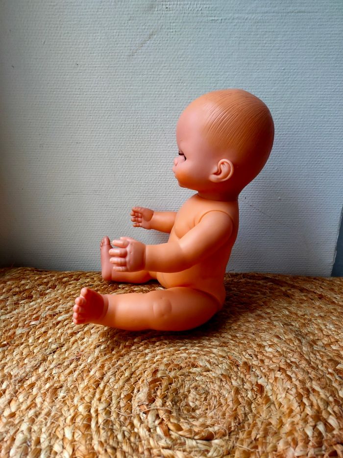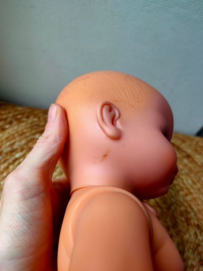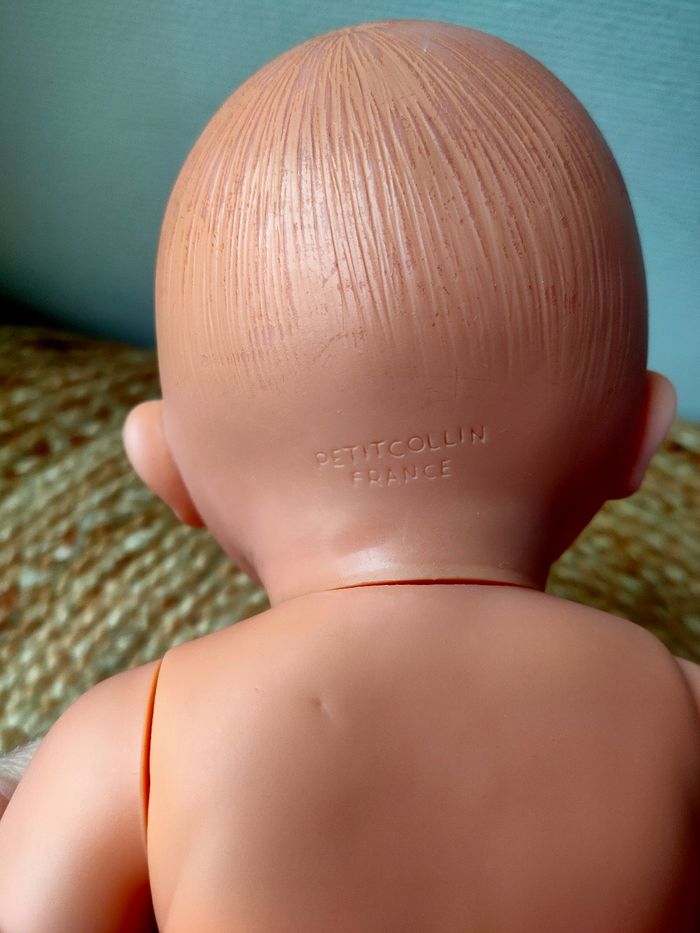 Poupée nue marque PetitCollin de Villac, fabriquer en France. Elle a quelques petits défauts notamment au niveau des cheveux et a une trace sous une oreille. Les défauts sont en photos. La poupée reste tout de même en très bon état.