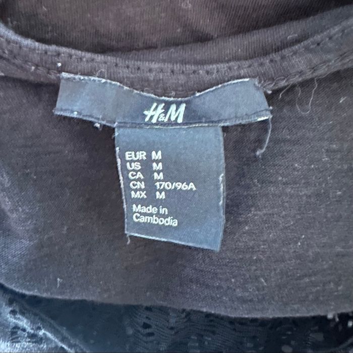 T-shirt - Excellent état - Taille 38 équivalent M Dimensions en bas de l’annonce - Marque H&M - Couleur noire - Dentelle transparente - Style goth, emo, punk, rock - 100% coton Dimensions: - 52cm niveau aisselles - 65cm de long