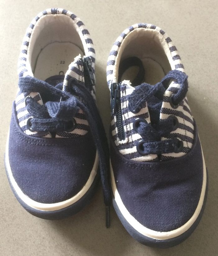 1/ Baskets de marque Nike - Pointure 22 - En bon état 2/ Chaussures en toile rayées bleu & blanc style marinière de marque Creeks - Pointure 22 - En très bon état 3/ Chaussures en toile de marque Gémo - Pointure 22 - En bon état 4/ Chaussures montantes en cuir de marque Pat et Ripaton - Pointure 22 - Usures sur le tour devant de la chaussure et lacets éventuellement à changer Le lot à 8 euros - Possibilité de vendre séparément à 2 euros la paire En livraison ou remise en main propre sur Montpellier