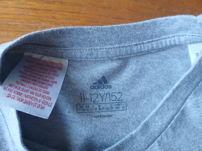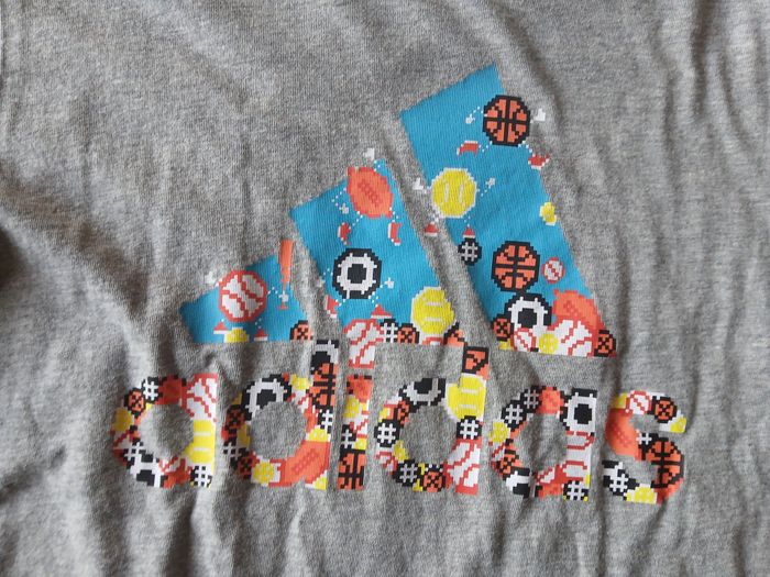 T-shirt à manches courtes Adidas, logo en ballons de basket, baseball, balles de tennis... en pixels. Taille 11 - 12 ans / 152 cm Très bon état