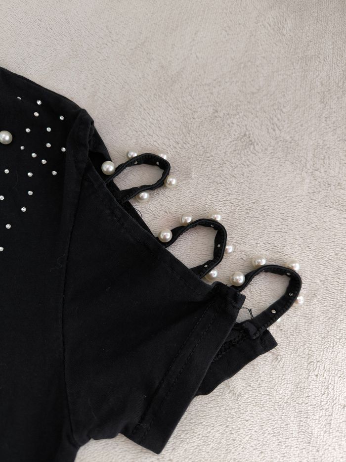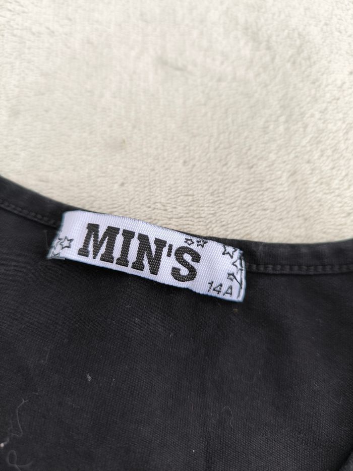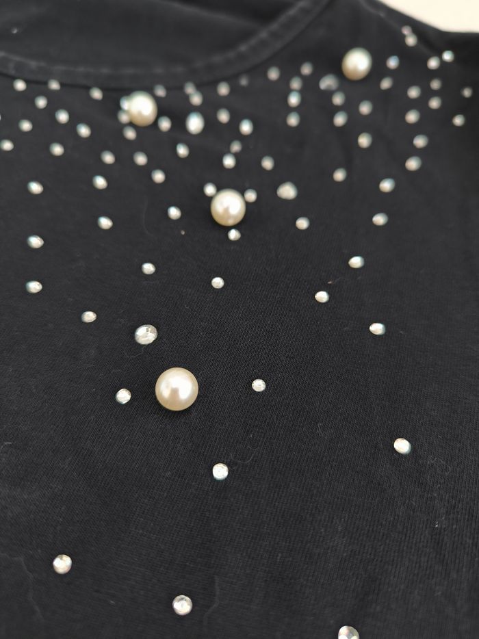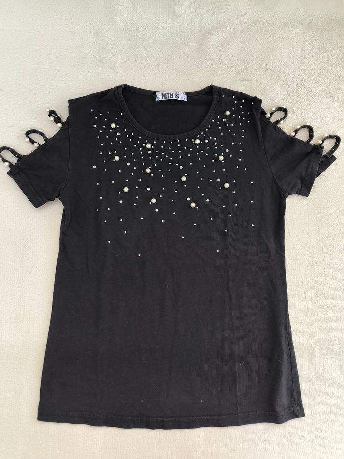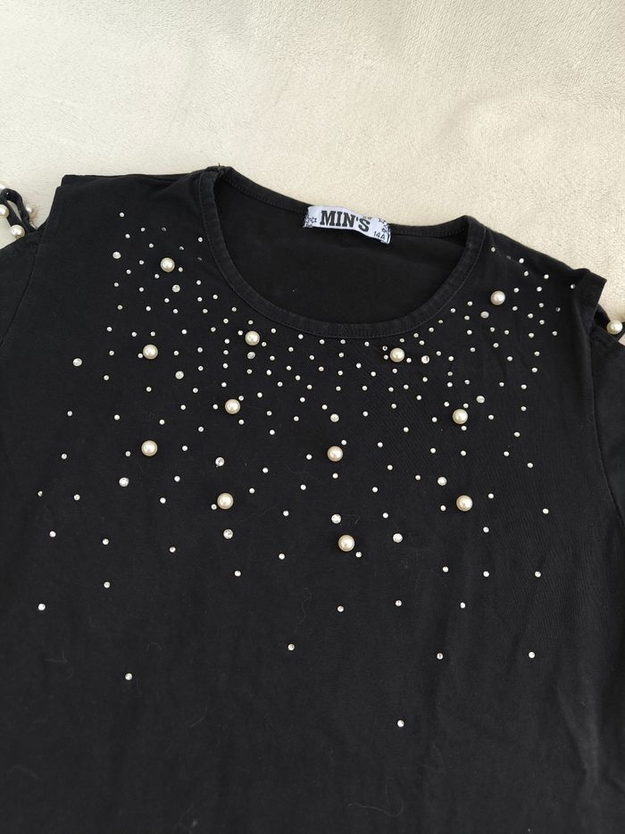 T-shirt à manches courtes Marque Min's Taille 14 ans • Coloris noir, argenté • Col rond • Strass et perles • Lanières ajourées aux manches • Coton fin En très bon état #evelyne_filles_14ans #evelyne_filles