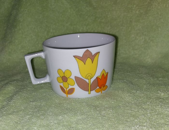 Très bel effet. Hauteur: 6,50 cm. Diamètre: 9,50 cm. Dessins fleurs sur les 2 cotés. Deux petits accrocs sous le socle, uniquement visible quand on retourne la tasse. Autres objets et jeux en vente, possibilité de faire un lot pour bénéficier d'une réduction sur le total. Vendeur sérieux et rapide.