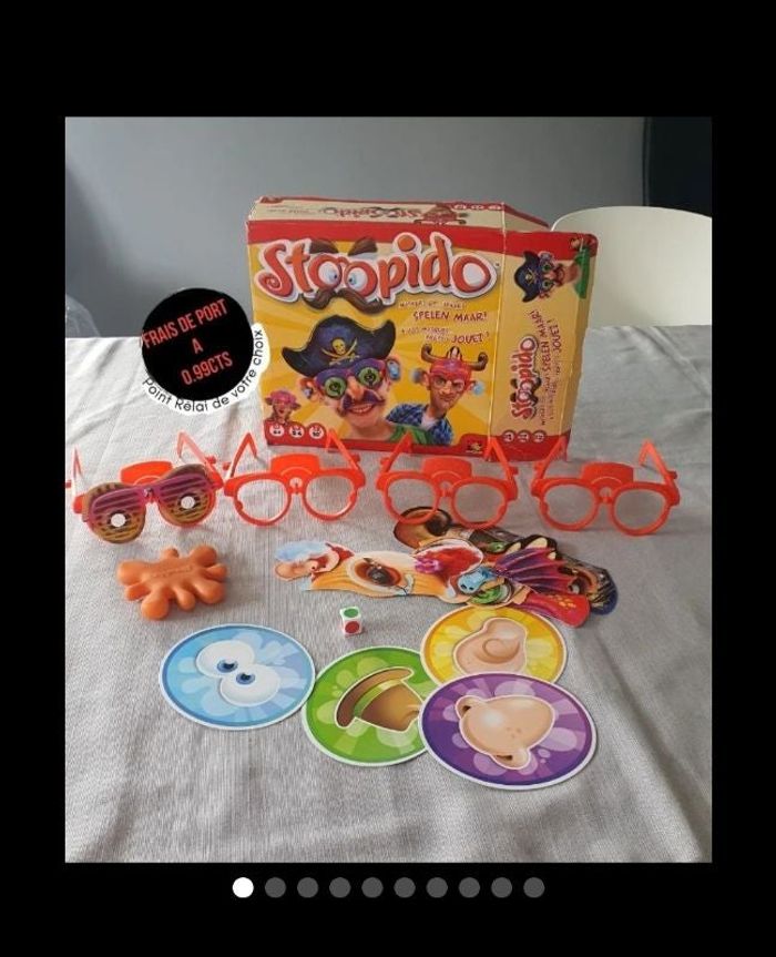 Jeu de société STOOPIDO -- A VOS MASQUES ! Age minimum: 6 ans Maison non fumeur et pas d'animaux. Envoi soigné et rapide ( max 48h sauf le week-end les colis seront déposé le lundi ) Possibilité de REDUIRE LES FRAIS DE PORT A 0.99CTS des 2 articles Pleins d'autres articles dans mon dressing alors n'hésitez pas à jeter un oeil. -----détails Manque 10 stoopido's mais possible de les faire soit même, imprimé image on peut plastifiée faire un petit trou et hop le jeu est complet.