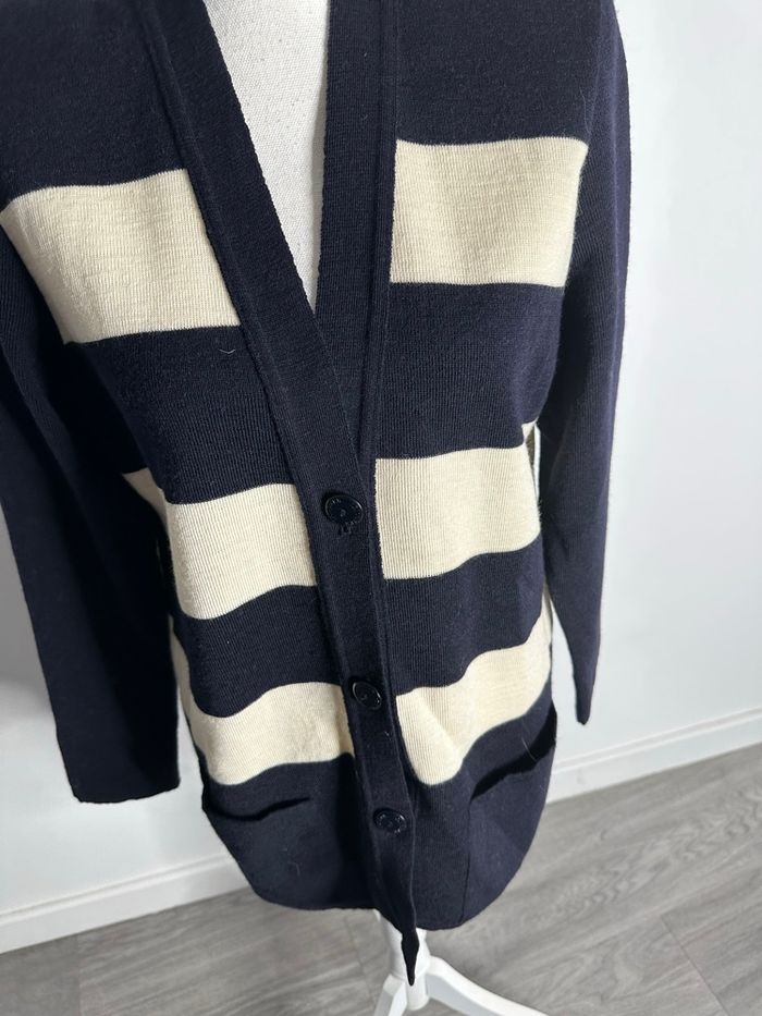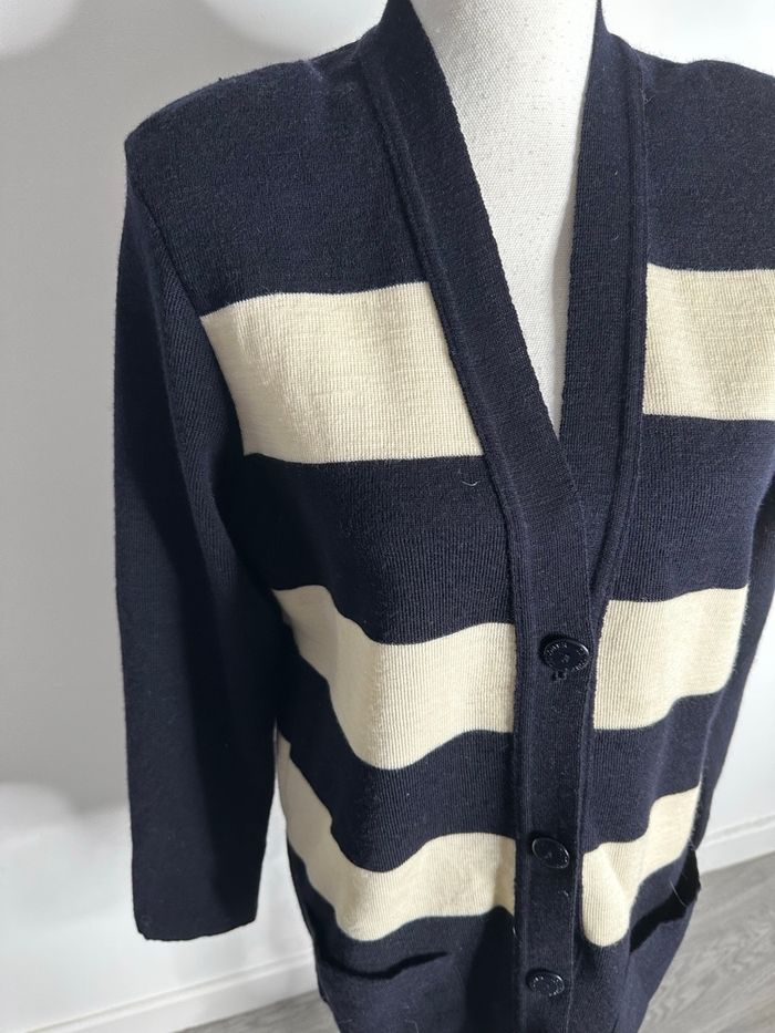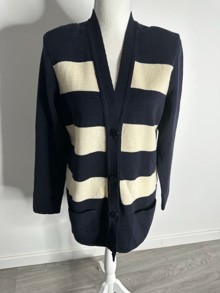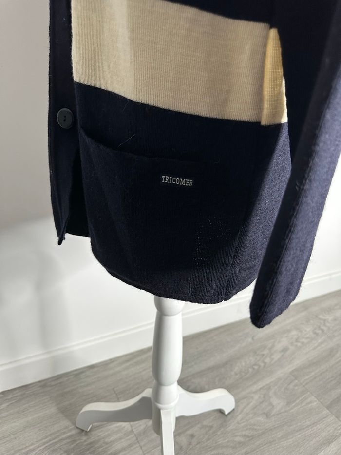 Cardigan - Excellent état - Taille 42/44 équivalent XL/XXL Dimensions en bas de l’annonce - Tricomer - Bleu marine et blanc crème - À rayures, marinière - Se ferme avec des boutons - Deux poches - 100% Laine vierge - Fabrication française 🇫🇷 - Vintage, années 70-80’ - Épaulettes, possible de les retirer - Ultra doux et chaud Dimensions: - 50cm niveau aisselles - 74cm de long