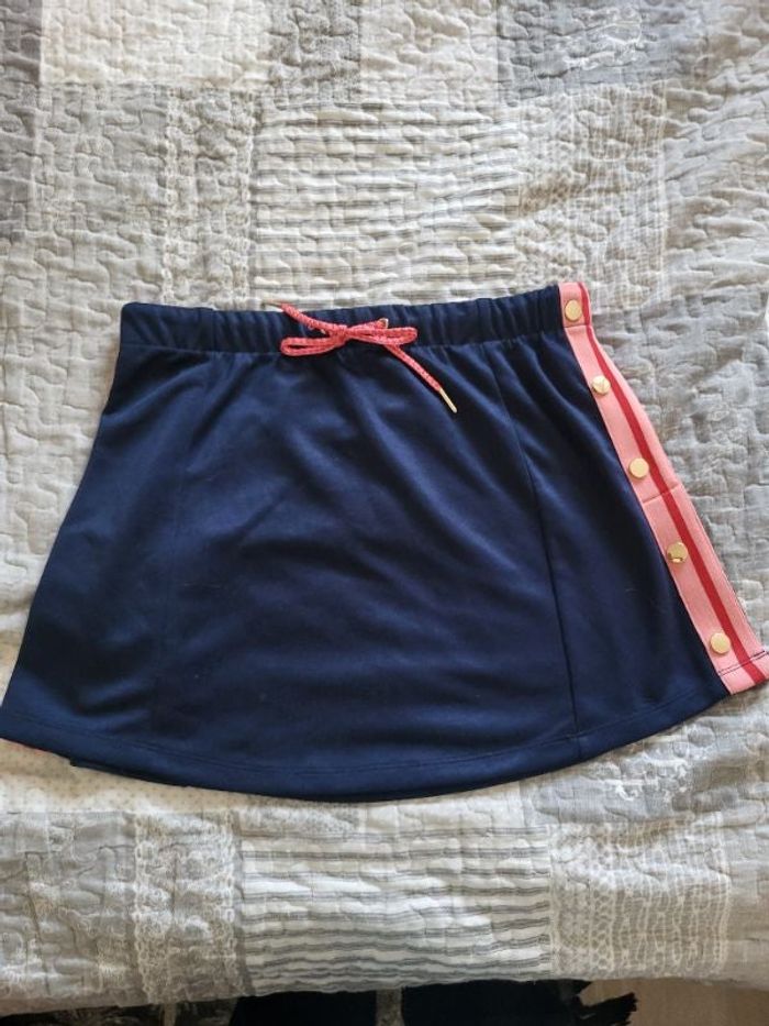 Jupe courte Teddy Smith bleu avec des bandes rouge et rose, en taille M, très bon état.