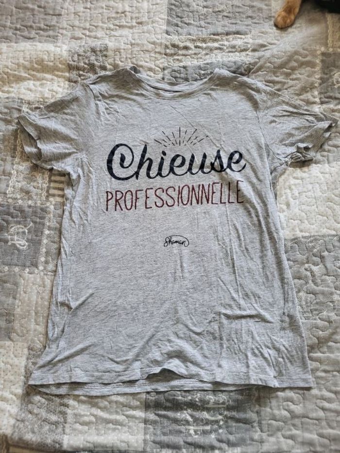 Tee shirt gris de chez undiz "Chieuse professionnelle" en taille XS. Un petit trou au niveau du col. Bon état.