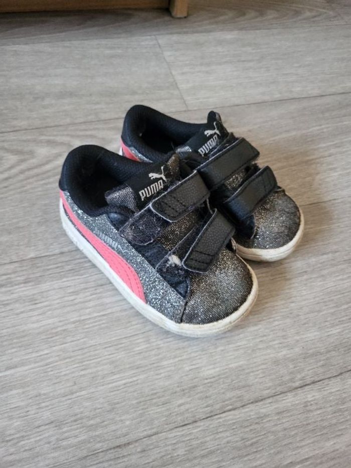 Baskets Puma en noir et rouge pailleté en pointure 21, bon état.