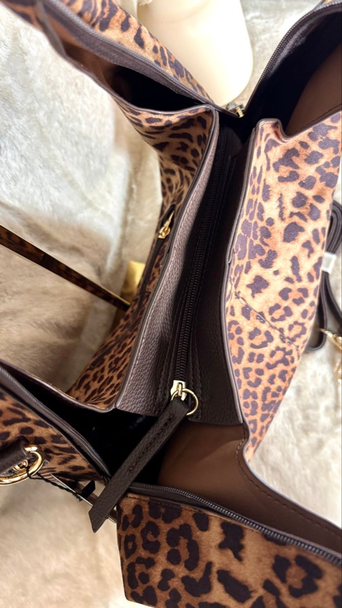 Superbe sac Flora & Co au motif léopard tendance 🐆, neuf avec étiquette. Bandoulière amovible et réglable, fermeture zippée sur le dessus, double compartiment intérieur et poche arrière zippée. Format pratique 36×30×16 cm, parfait pour un look audacieux et élégant au quotidien ✨