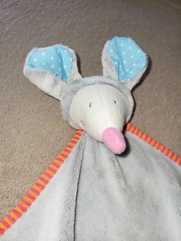 Doudou plat souris gris tout doux avec mouchoir Dimension du carré environ 27,5cm Grelot dans la tête de la souris Oreilles avec bruit de papier froissé Très bon état N'a pas été choisi comme LE doudou #virgy61joueteveil #virgy61puericulture