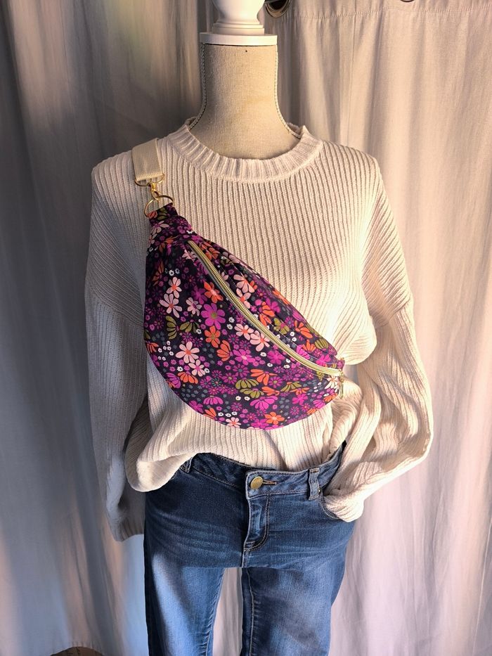 Jolie banane en coton fleuri mauve, doublée en coton vieux rose 🌸 Ses dimensions (37x17 cm) offrent une belle contenance tout en restant élégante et confortable à porter. Parfaite pour garder tes essentiels à portée de main lors de tes sorties du quotidien.Crez Une pièce unique, à la fois tendance et pratique 🤍