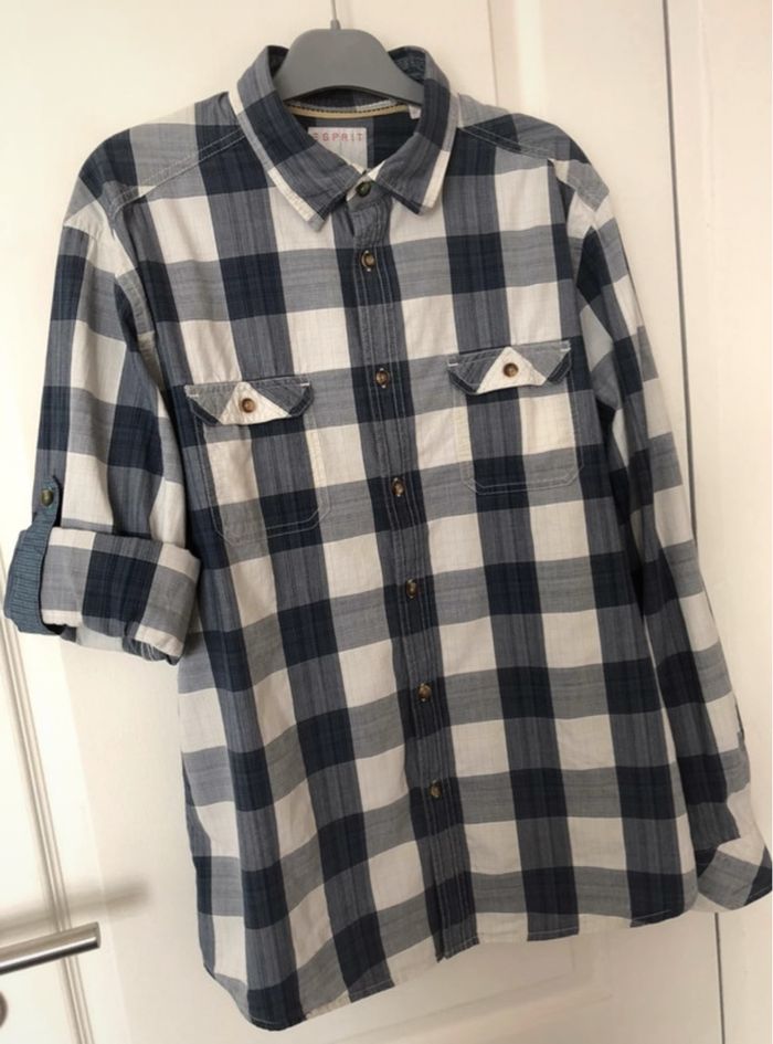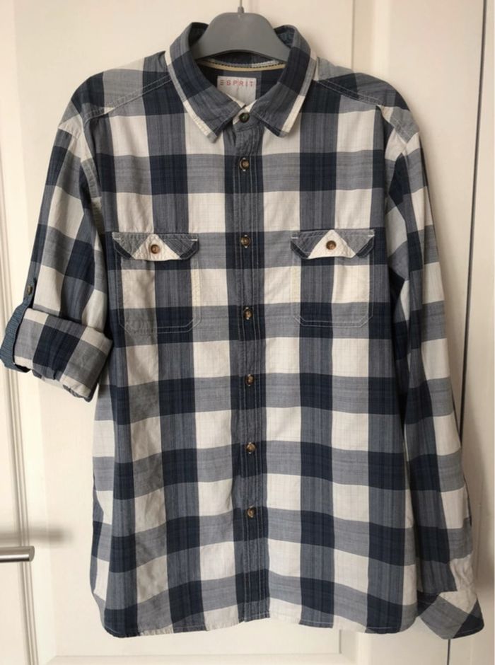 Vends chemise de la marque «  ESPRIT », taille XL, à carreaux bleus et blancs, possibilité de la porter aussi avec les manches courtes, neuve : en très bon état
