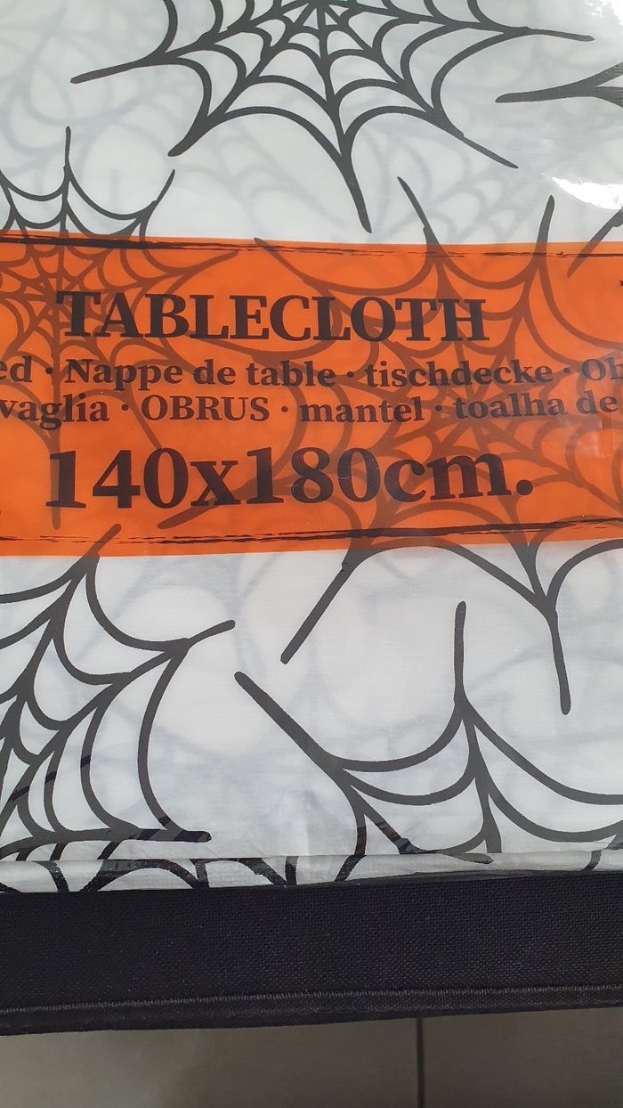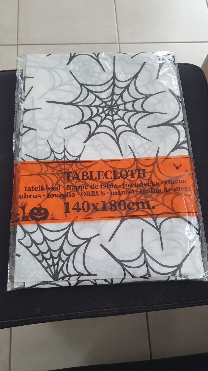 Je vends cette nappe de table Halloween neuve, avec un motif de toile d'araignée en noir et blanc.