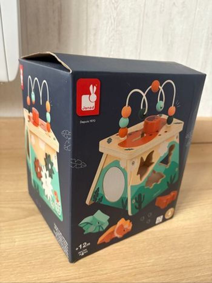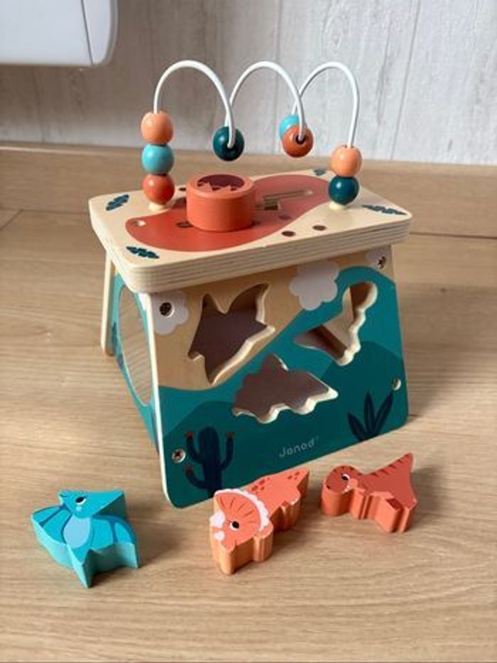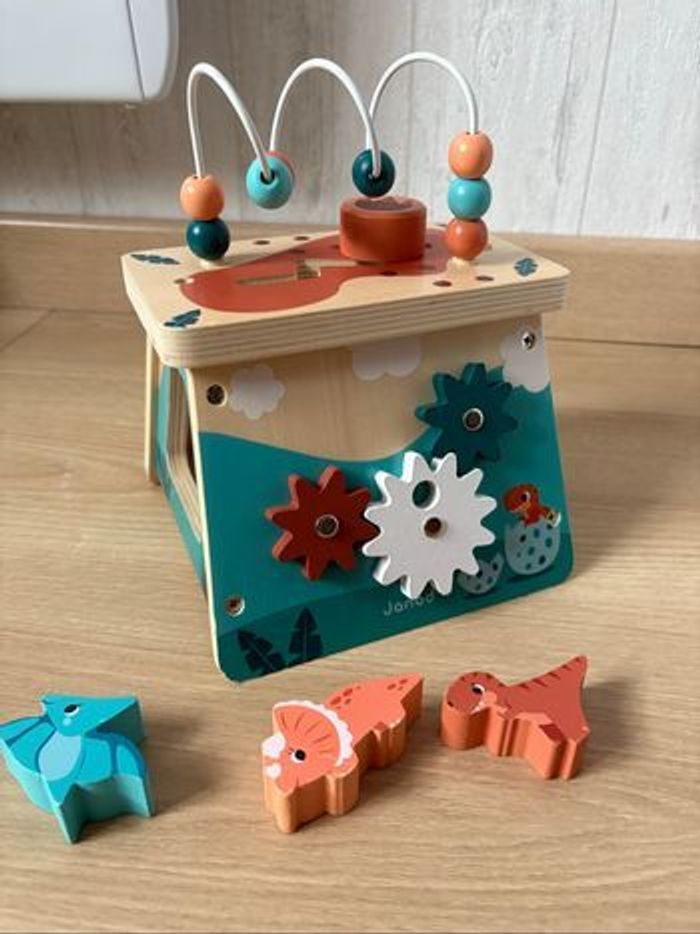 Il offre de nombreuses activités : boîte à formes avec petits dinosaures (tyrannosaure, tricératops, ptéranodon), engrenages à tourner, miroir latéral, boulier à perles sur le haut, labyrinthe…