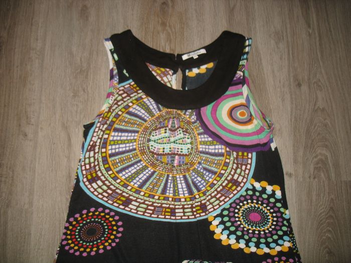 #42_Femme_Nathg2210 ROBE SM NOIRE A MOTIFS "U COLLECTION" - TAILLE 42 / 44 - n°02 Robe sans manche courte noire avec motifs multicolore - Col rond noir - Fermeture dos par 2 boutons - Dimensions épaule à épaule 38 cm et longueur totale : 87 cm - Matière : 100% viscose. Article d’occasion en très bon état - Sans trou - Ni tache - Lavé et repassé pour la vente. Possibilité d'envoyer d'autres photos sur simple demande. Maison non-fumeur - Sans animaux. Réduction lot activée. Allez voir mes autres ventes, je vide les placards. Beaucoup de vêtements de marque et beaucoup de jouets. Remise en mains propres ou possibilité d'envoi au tarif en vigueur à votre charge. Retour Refusé. Pour tout renseignement, n'hésitez pas à me contacter, je répondrai volontiers à vos questions. Réponse Assurée. Pour Consulter mes autres annonces tapez Nathg2210.