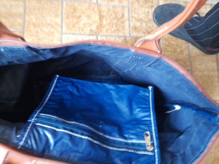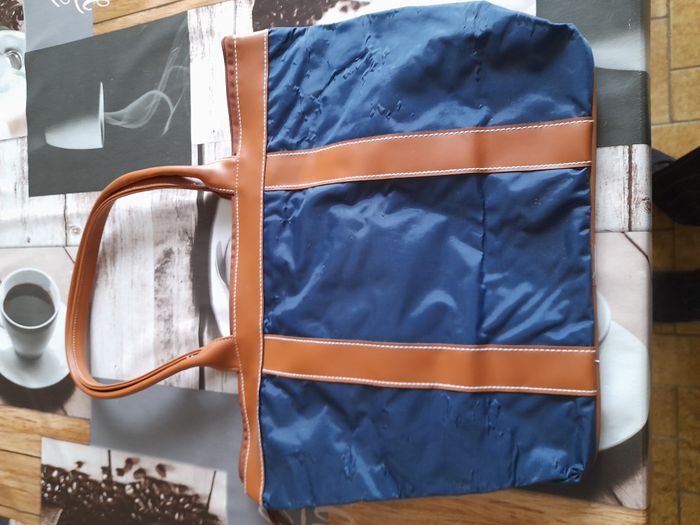 Petit sac de voyage bleu et marron marque Travel & Pleasure hauteur 29 cm largeur 40 cm épaisseur 14 cm il y a une petite pochette à l'intérieur voir photo 4 il y a des petites cloques Polyamide et PVC Neuf jamais utilisé 2 euros