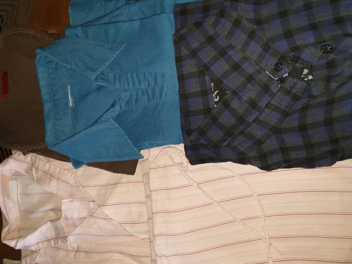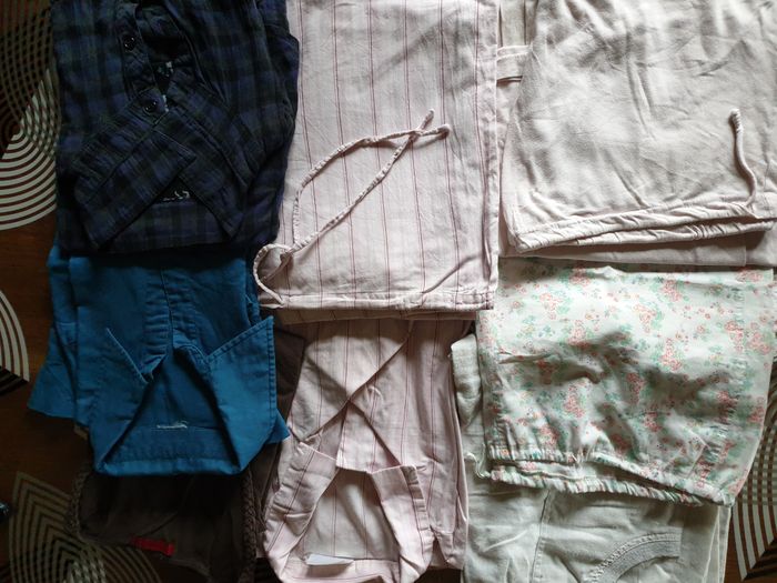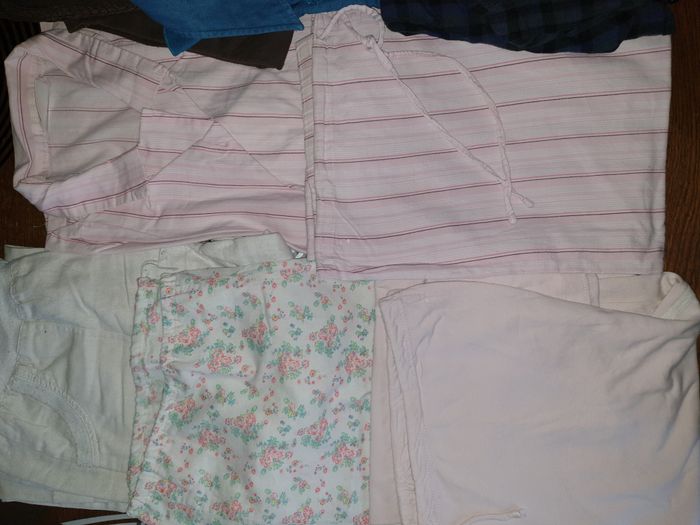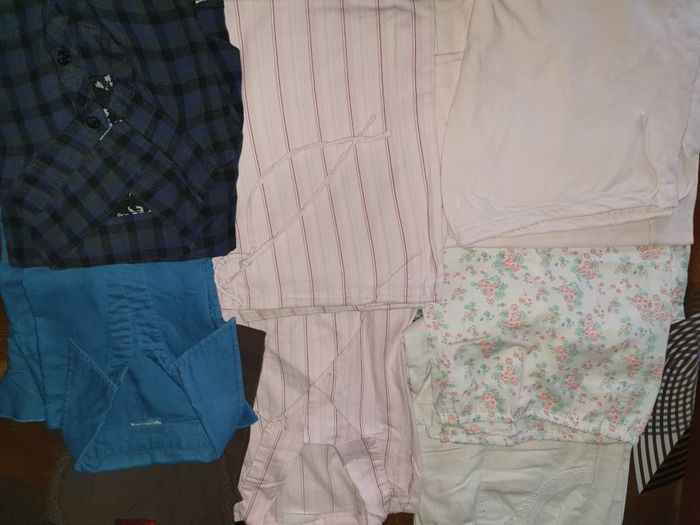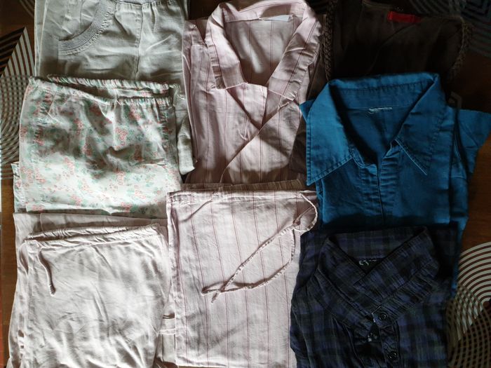 Lot pour dépannage, ou récupe ou customisation etc ... comprenant : 1 t-shirt marron, pantalon de pyjama x 3, 2 hauts style liquette ou chemise et un ensemble veste + bas de pyjama (élastique à changer). Le tout est en coton, dans un état satisfaisant. taille 42 - 42/44