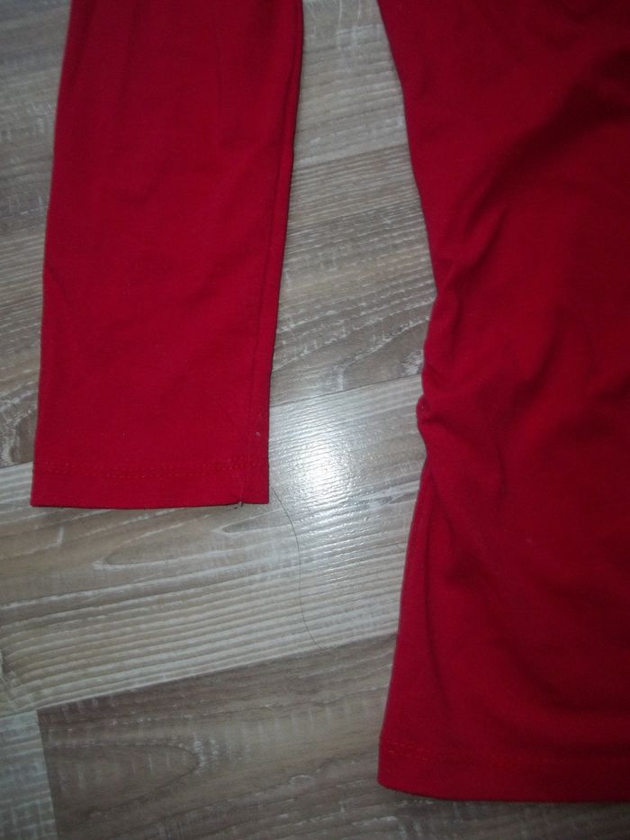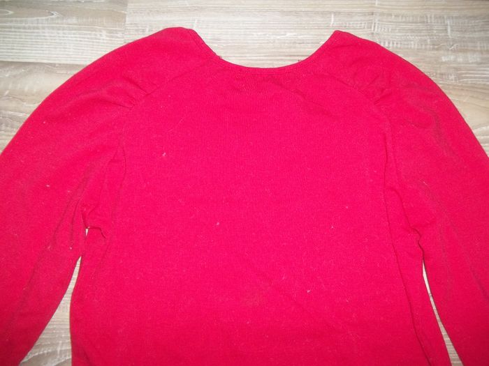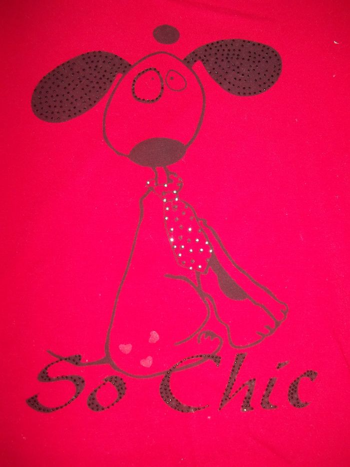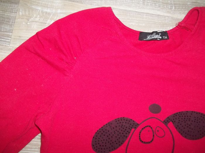 Tee-shirt long à manches longues et col rond,rouge (65 % coton 30 % polyester 5 % élasthanne). Manches à emmanchures style américaines mais froncées, froncé également sur côté niveau "taille" par élastiques. Chien à cravate assis en contour noir avec petits points en relief (certains décollés). Longueur 66 cm, manches 38 cm sous le bras, largeur aisselles 39 cm, poignets 9 cm. Taille peut-être un peu petit pour du 14 ans. TS1