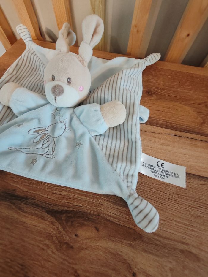 Doudou Lapin Plat Carré Bleu rayé marron marque Nicotoy Tbe Étiquette marque présente 9.90.euros Envoi en relais