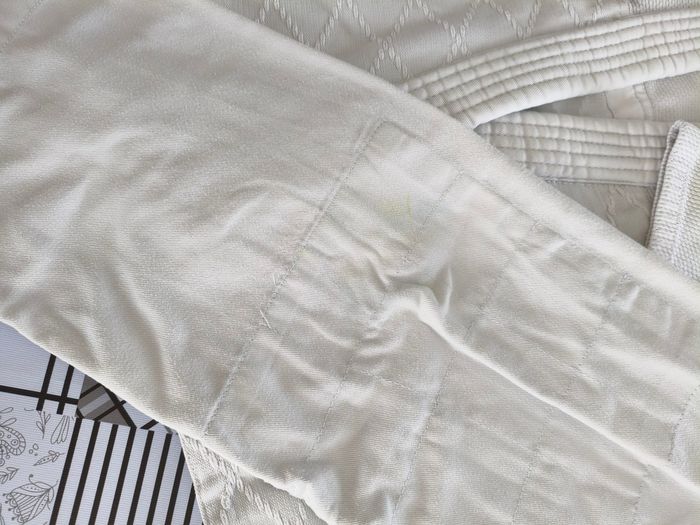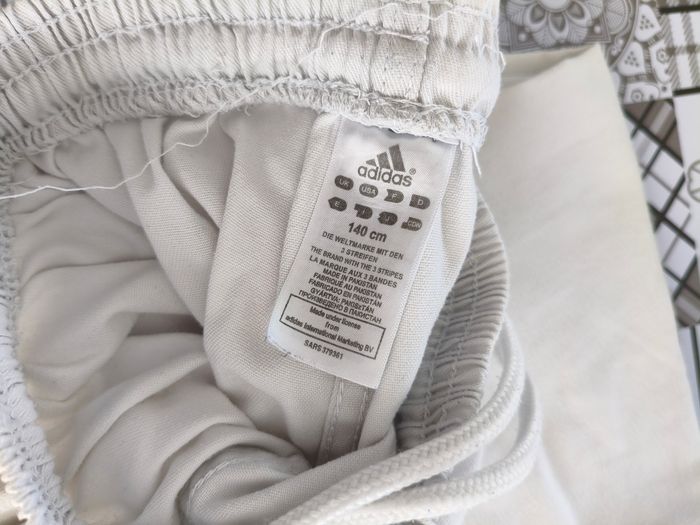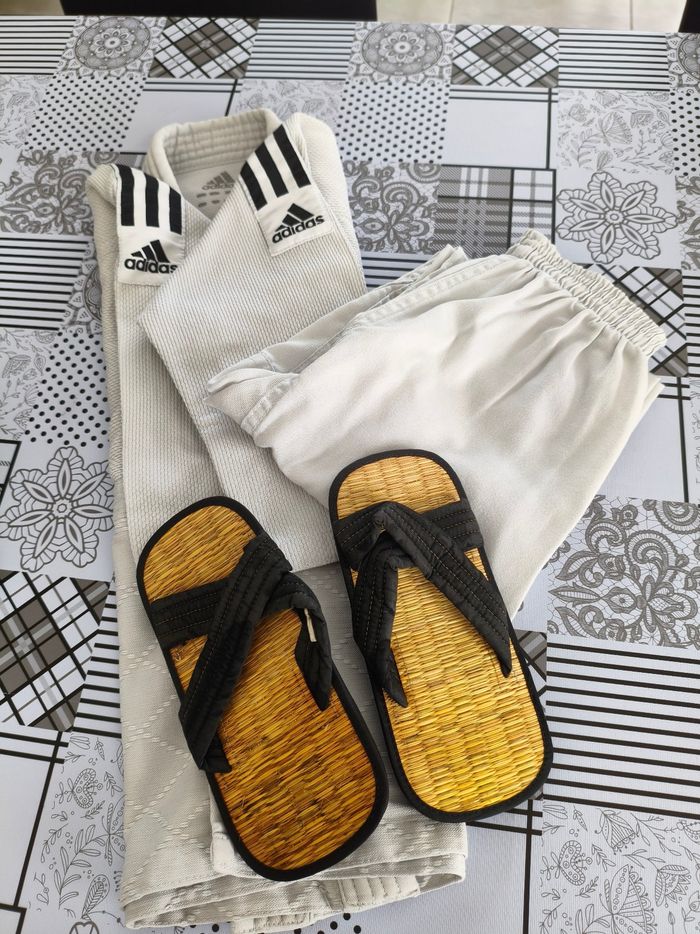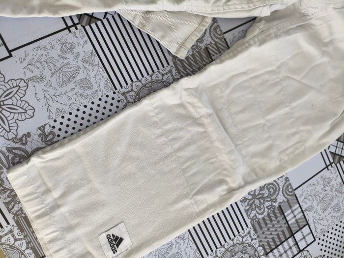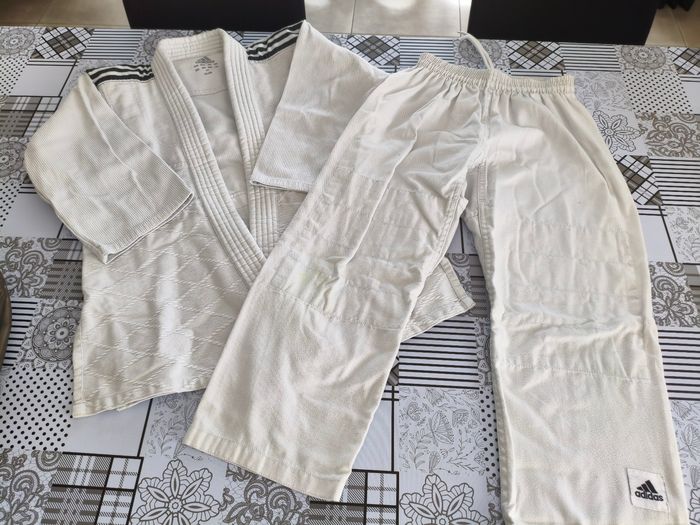 Judogi Kimono Adidas 130cm Veste grain de riz Vendu avec zoories Excellent état Le pantalon est marqué vert au niveau des genoux à cause des frottements sur le tatami (Voir photo)