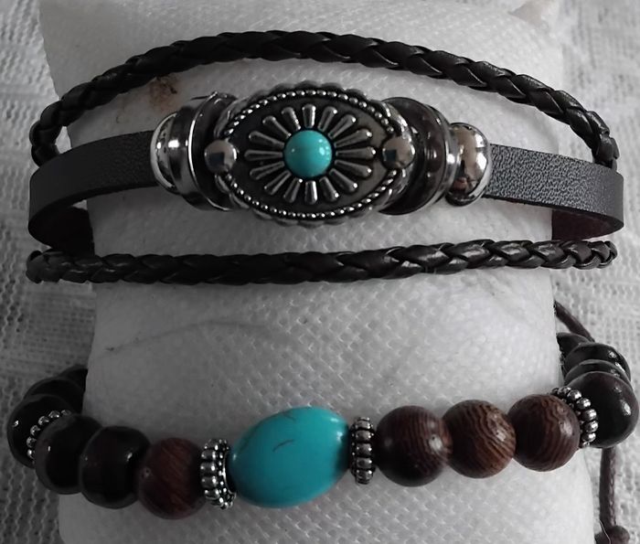Lot de 2 bracelets hommes en cuir synthétique de couleur marron 1 bracelet de perles en bois de couleur marron et élastique résistant 1 bracelet réglable de couleur marron avec lanière et une plaque de couleur argentée avec motif fleur et au coeur de la fleur une pierre de couleur turquoise