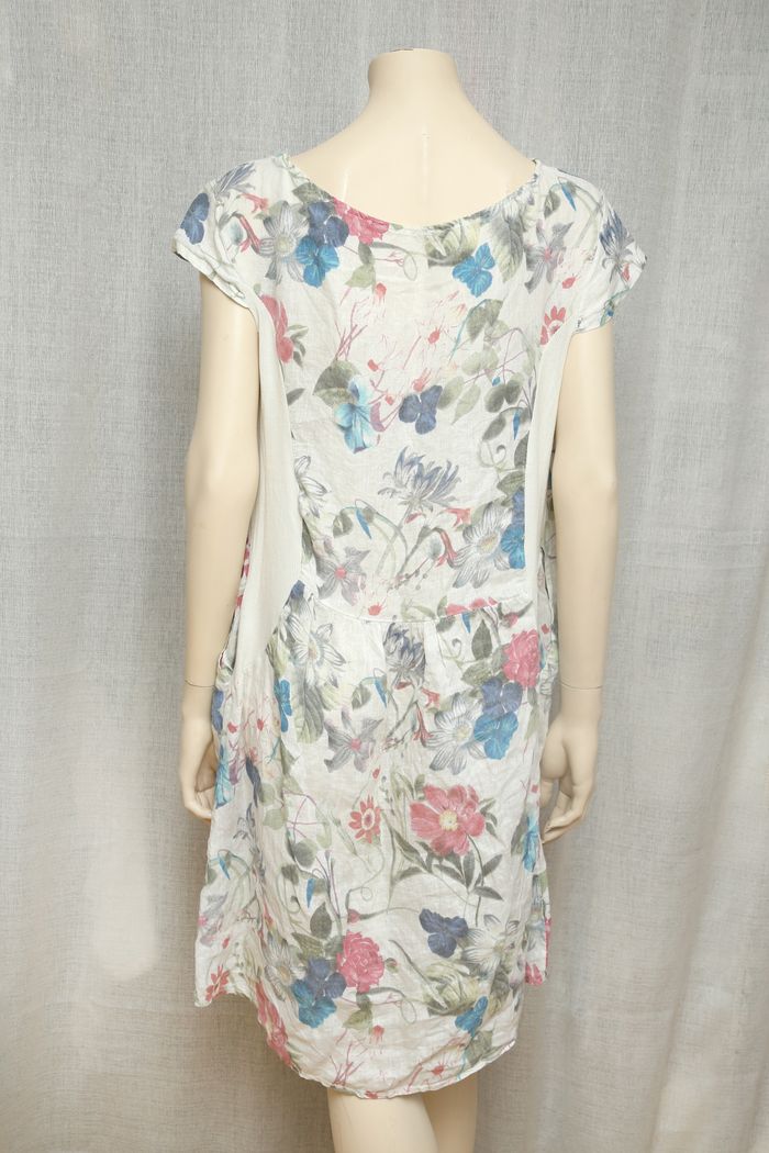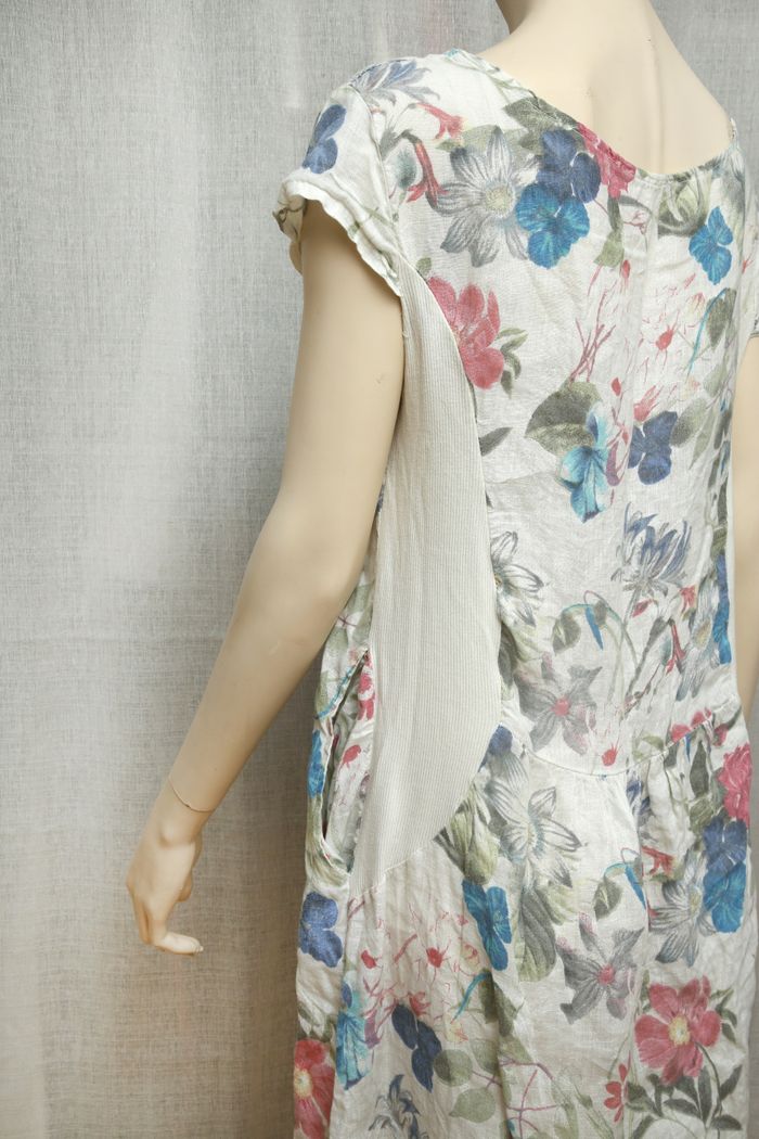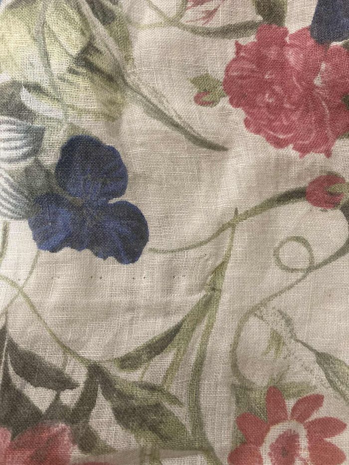 Je pense qu'initialement il y avait un élastique sous la poitrine (voir photo 4) car il y a comme des petits trous. Plus d’étiquettes ni de taille ni de composition. Environ 94cm du col au bas et 50cm d’aisselle à aisselle.