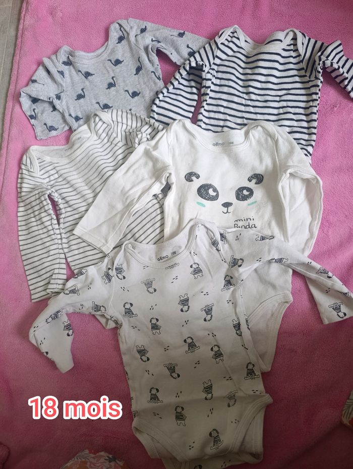 Lot de 5 bodies manche longue taille 18 mois bon état. Certains dessin qui s'efface quelques imperfections mais propre. Marque essentiellement gemo.
