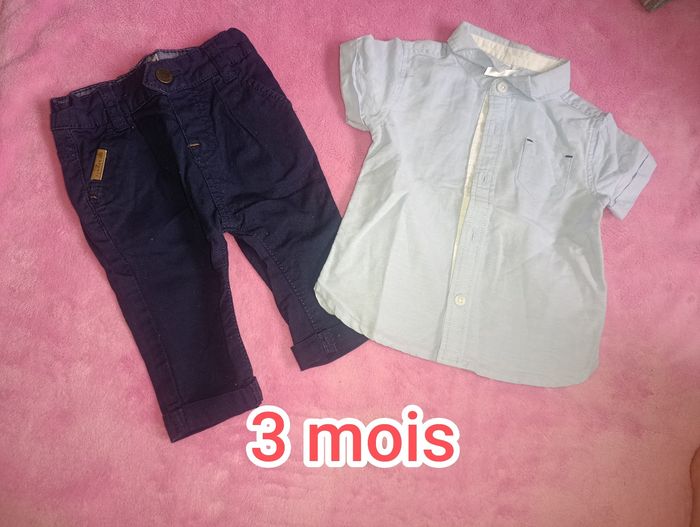 Pantalon marque gemo taille 3 mois très bon état et chemise orchestra 3 mois très bon état. Ensemble discociable.
