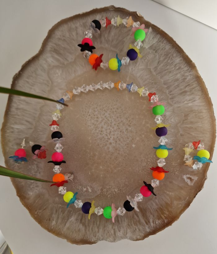 Magnifique parure de bijoux pour petite fille qui est composée d'un collier , d'une paire de boucles d'oreilles d'un bracelet et d'une bague dans les couleurs flashy et pastels.